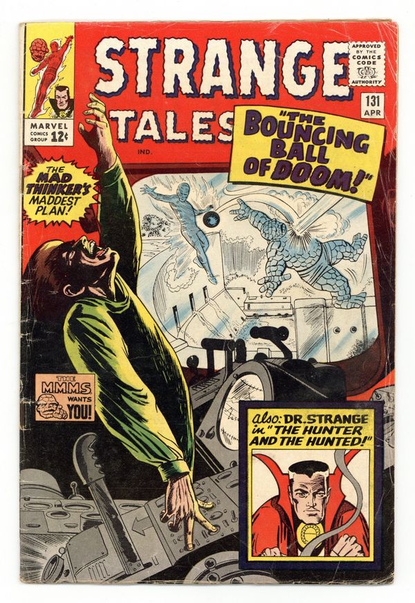 Cover pencils by Bob Powell, Steve Ditko (Dr. Strange figure), inks by Mike Esposito and Steve Ditko (Dr. Strange figure). The Human Torch and the Thing star in "The Bouncing Ball of Doom!", script by Stan Lee and Bob Powell (co-plot), pencils by Bob Powell, inks by Dick Ayers; The Mad Thinker's latest plot involves a flying, electronics-laden metal ball, which nearly manages to destroy a dam; Cameos by Reed Richards and Sue Storm. "The Hunter and the Hunted!", script by Steve Ditko (plot) and Stan Lee (dialogue), art by Steve Ditko; In the far East, Strange is on the run from Mordo and his minions, unaware that Mordo's increased power comes from Dormammu; As Mordo forcibly recruits more followers to search for Strange the mage makes plans to hop a plane to New York City. Statement of ownership--average print run 315,500; average paid circulation 214,800. 36 pgs., full color. Cover price $0.12.