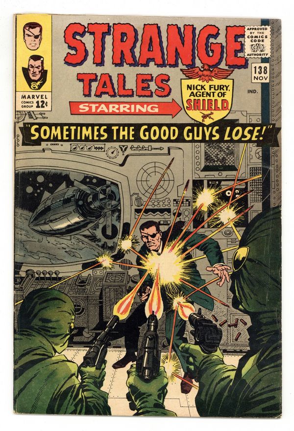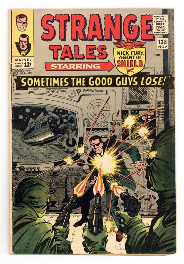 Cover pencils by Jack Kirby, inks by John Severin. "Sometimes the Good Guys Lose!", script by Stan Lee and Jack Kirby (co-plot), pencils by Jack Kirby (layouts) and John Severin, inks by John Severin; Aboard SHIELD's Intercontinental Ballistic Plane Fury uses the Televiewer Tube to locate the Betraton Bomb launch site; It is destroyed but the bomb was already launched; Agent G unsuccessfully implores her father, Imperial Hydra to come to his senses; He sends HYDRA's Fox Division to deliver his terms to every nation on Earth; Tony Stark prepares to show Fury the Braino-Saur,a new weapon when HYDRA agents capture him. "If Eternity Should Fail!", script by Steve Ditko (plot) and Stan Lee (dialogue), art by Steve Ditko; In another dimension that defies description, Dr. Strange comes face-to-face with Eternity, who learns that Strange is indeed worthy of The Ancient One's trust; He knows that if Mordo & Dormammu are not stopped, all mankind will be in jeopardy; But after all Strange has been through, Eternity tells him he already has the power he needs; First appearance of Eternity; Appearance by Clea. 36 pgs., full color. Cover price $0.12.
