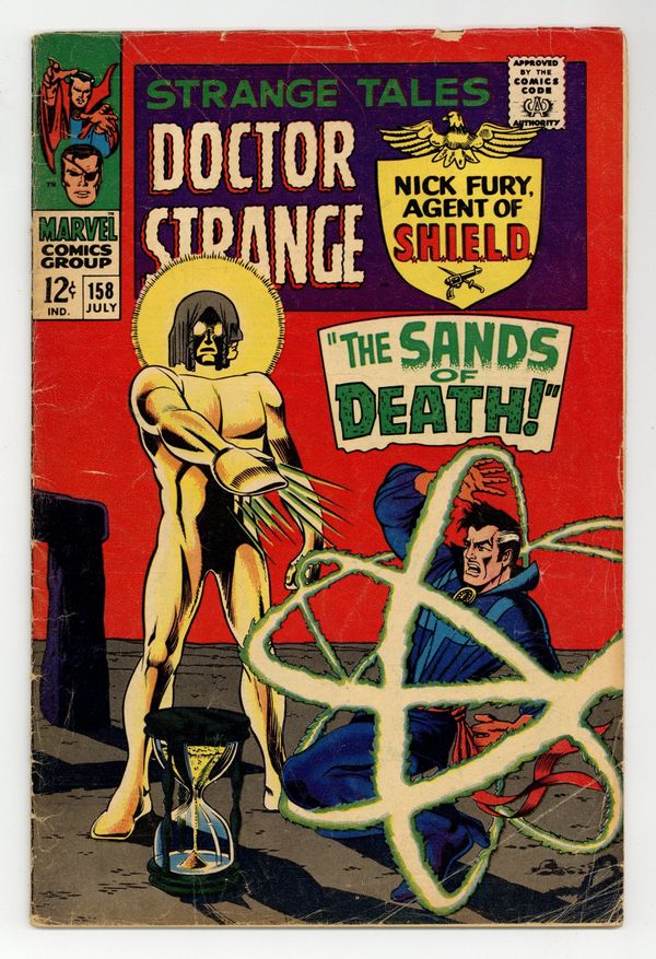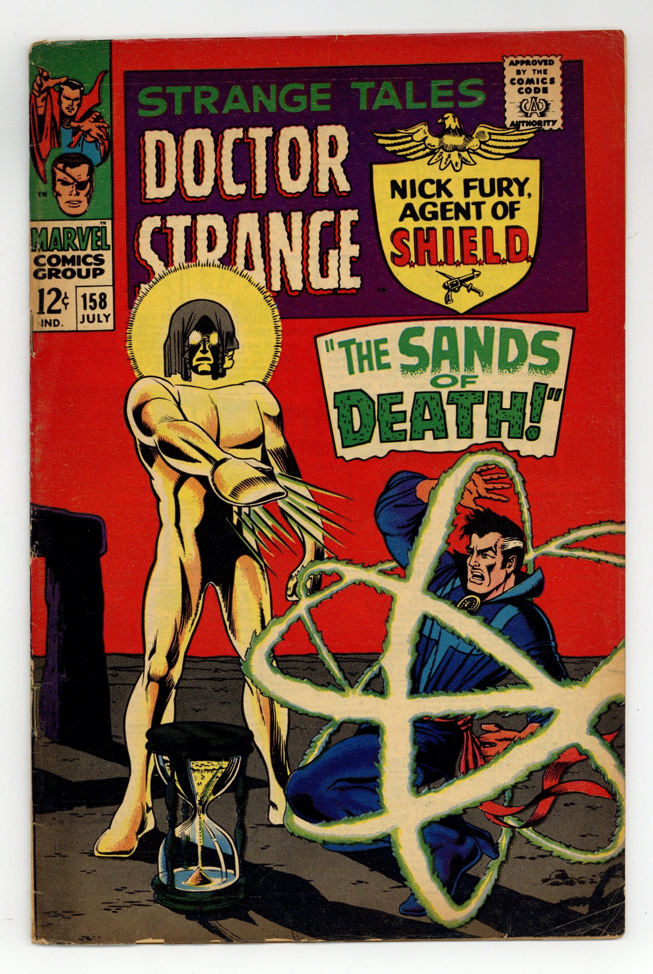 Cover pencils by Marie Severin. Nick Fury stars in "Final Encounter!", script and art by Jim Steranko; The battle between Fury & Strucker rages until Fury manages to remove his Satan glove; Minutes later, as HYDRA thugs enter the room, they discover 2 Strucker's! One of them is revealed to be wearing a mask, panics, and is incinerated in an Alpha-Particle Reactor Cube; The other orders Laura put aboard the Dyna-Soar and takes off from Hydra Island, despite the imminent detonation of The Death Spore bomb. "The Sands of Death," script by Roy Thomas and Marie Severin (co-plot), pencils by Marie Severin, inks by Herb Trimpe; The Living Tribunal decrees that because Doctor Strange has unleashed a menace to the cosmos Earth must be destroyed; Before he recites the Incantation of Oblivion he recounts events leading up to his decision, agreed upon by his 3 faces of Equity, Revenge & Necessity; Doctor Strange challenges the Tribunal to let him deal with the menace, having defeated the forces of darkness in the past. Strange is granted a reprieve for as long as it takes the Sands of Death to run out of a mystic Hourglass resting in the middle of Stonehenge; Cameos by Dormammu and Umar. Letter to the editor from comics writer Bill Mantlo. Merry Marvel Marching Society info and coupon. 36 pgs., full color. Cover price $0.12.