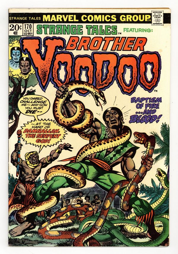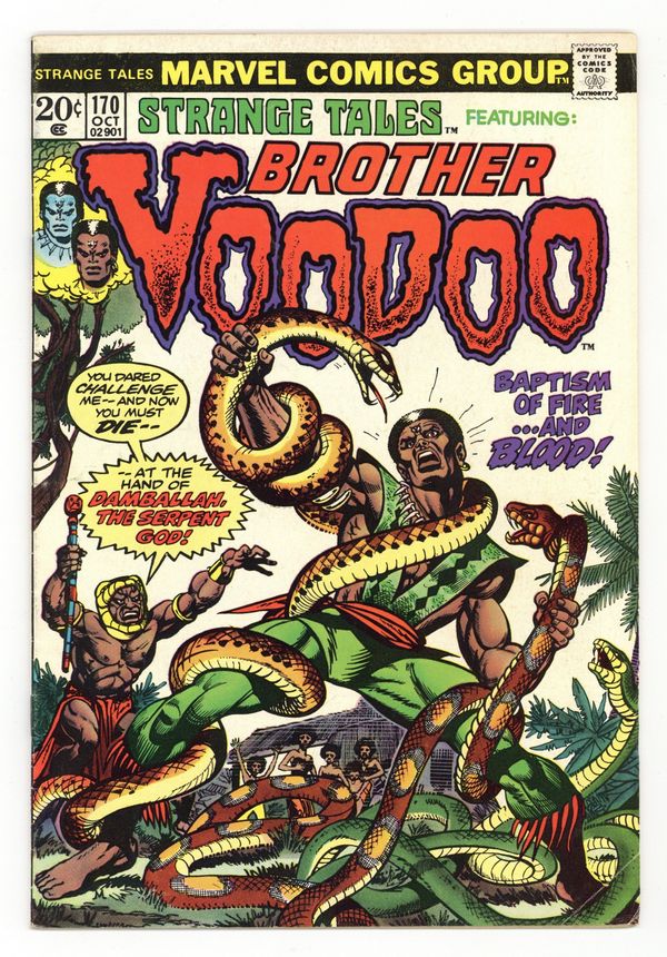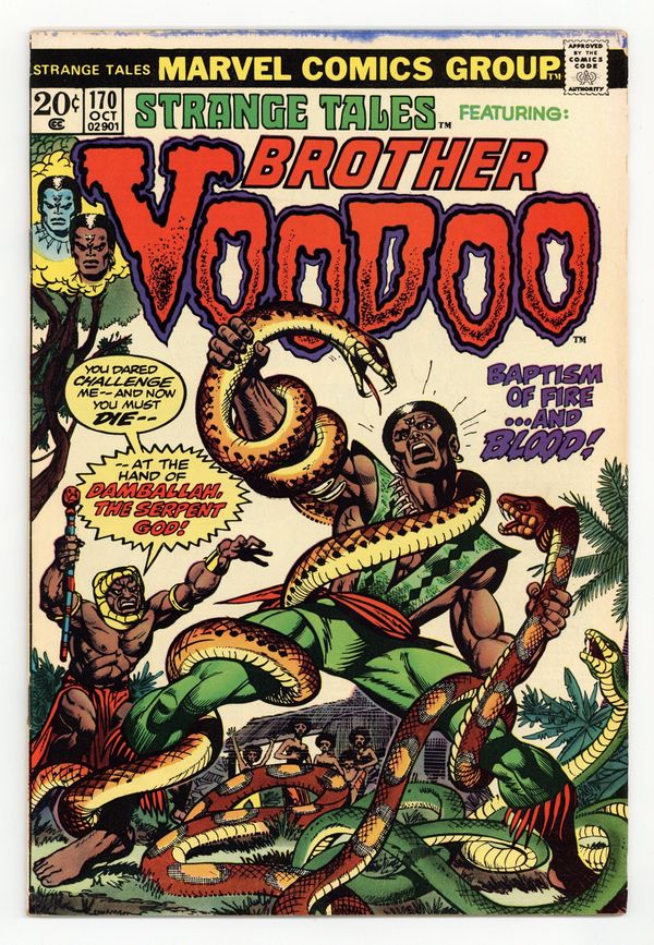 Cover pencils by Gil Kane. "Baptism of Fire!", script by Len Wein, pencils by Gene Colan, inks by Dan Adkins; Papa Jambo trains Jericho Drumm to be Brother VooDoo; Brother VooDoo then returns and stops Damballah, the Serpent God. 36 pgs., full color. Cover price $0.20.