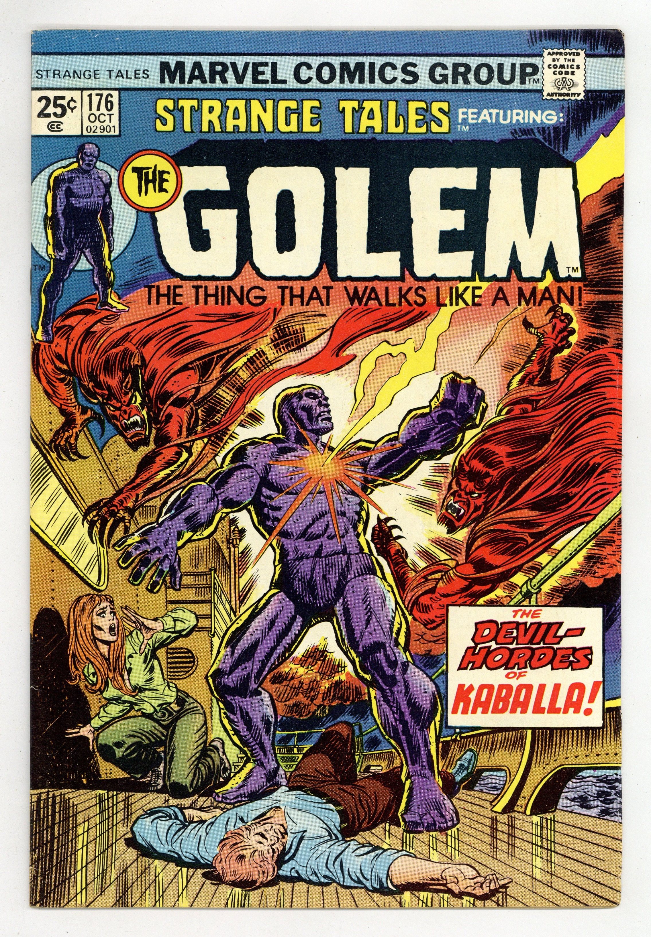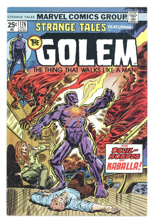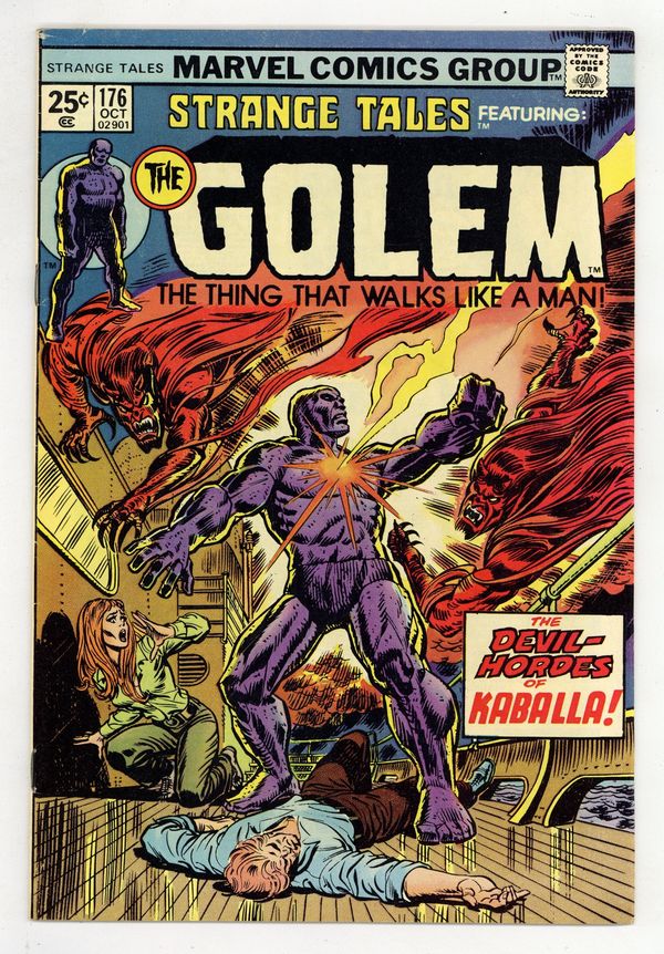 $6.70Cover art by John Romita. "Black Crossing," script by Mike Friedrich, art by Tony DeZuniga (not Luis Dominguez); Having just been saved by the Golem from a rebel army, Wayne Logan and Jason and Rebecca Adamson are shocked at the creatures lethal methods; As the statue becomes inert again, they theorize how Rebecca's recently deceased grandfather Abraham Adamson, managed to revive the creature; the Golem becomes a subject of interest for a sorcerer named Kaballa, who wishes to destroy the it. Reprint of an old weird story, "The Man Who Couldn't Be Killed!" (from Adventure Into Mystery 8), art by Jimmy Infantino; A man is going to be hanged on Monday so he escapes from jail and gets a potion from a witch doctor that will remove all Mondays from his life. The letters page contains Marvel Value Stamp series A #94 (Electro by Steve Ditko). 36 pgs., full color. Cover price $0.25.