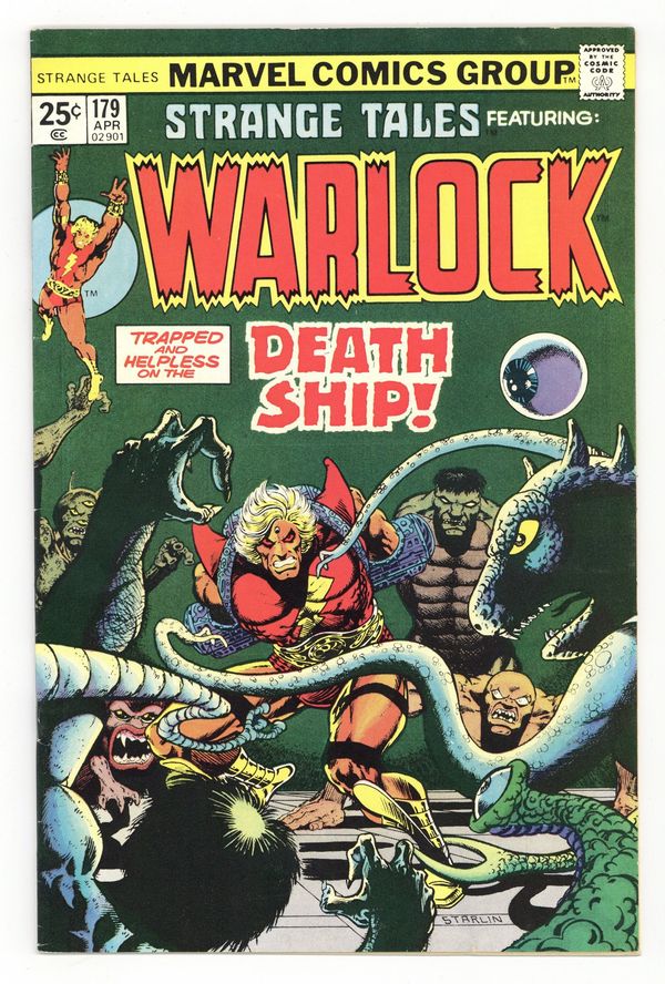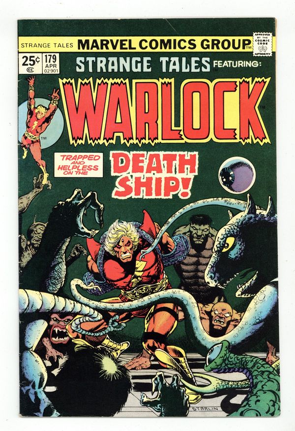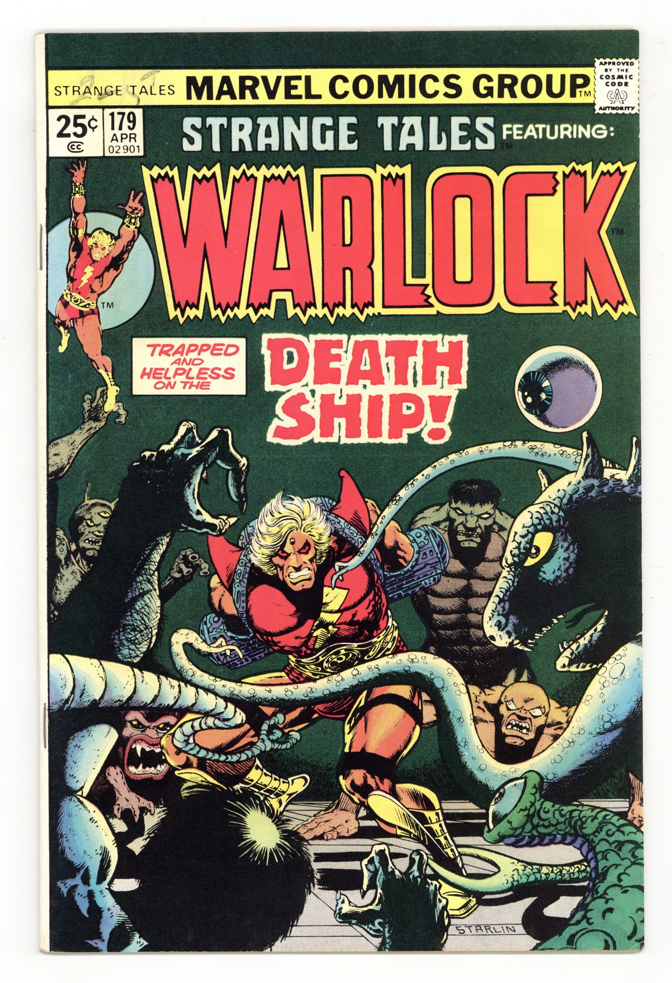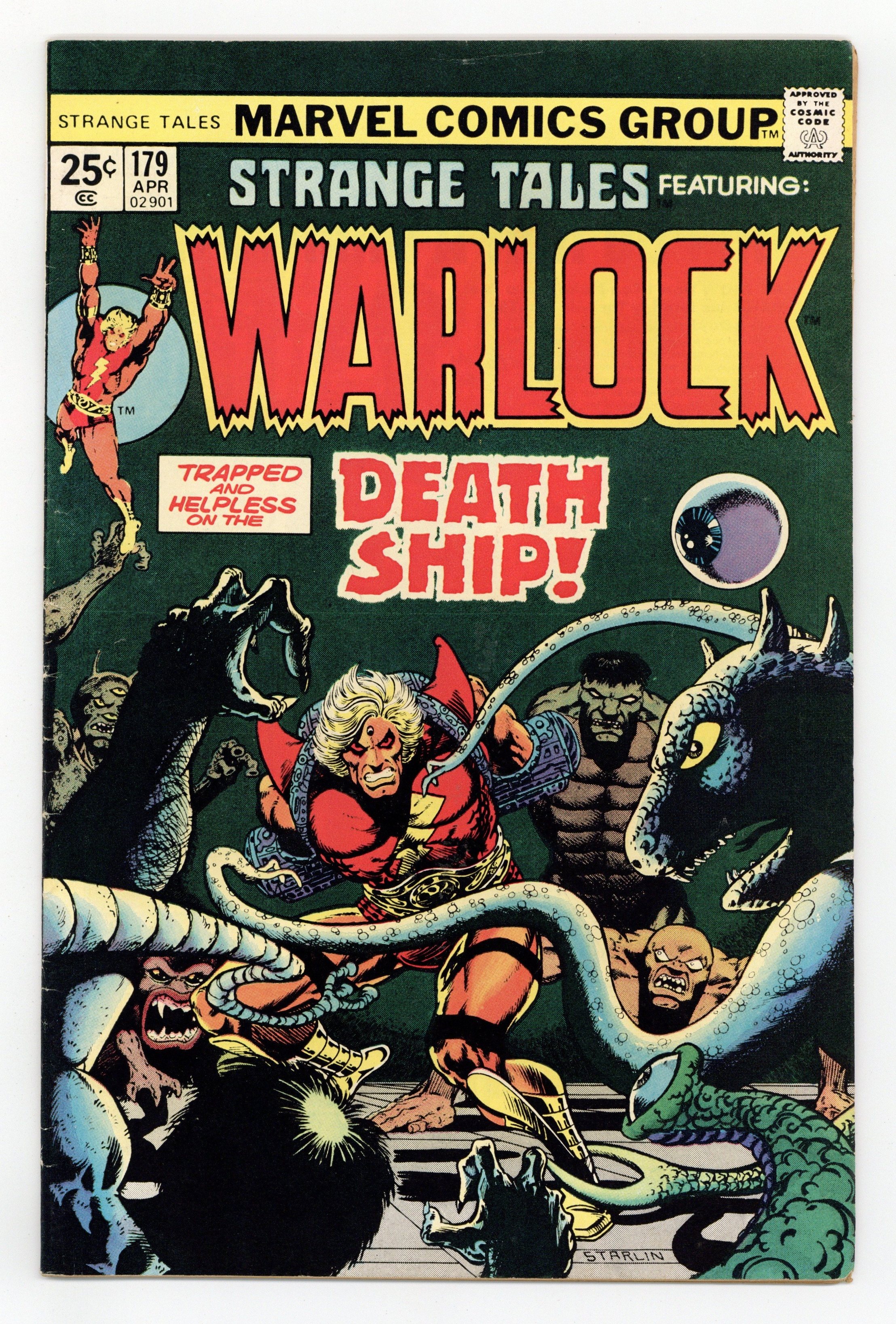 Cover art by Jim Starlin. "Death Ship!", script and art by Jim Starlin; Warlock is captured by Autolycus of the Black Knights an brought aboard Magus' Flagship; His fellow prisoners tell Warlock, that survivors of the Wars of the Church are taken as slave laborers, those who refuse will be terminated and their remains will be chemically broken down and valuable elements that can be retrieved will be used to further the cause of the Church; They also tell him, that Non-Humanoids are not considered fashioned in the Magus' image and thus must be disposed of, this also holds true for some Humanoid types—such as Trolls; First appearance of Pip the Troll. 36 pgs., full color. Cover price $0.25.