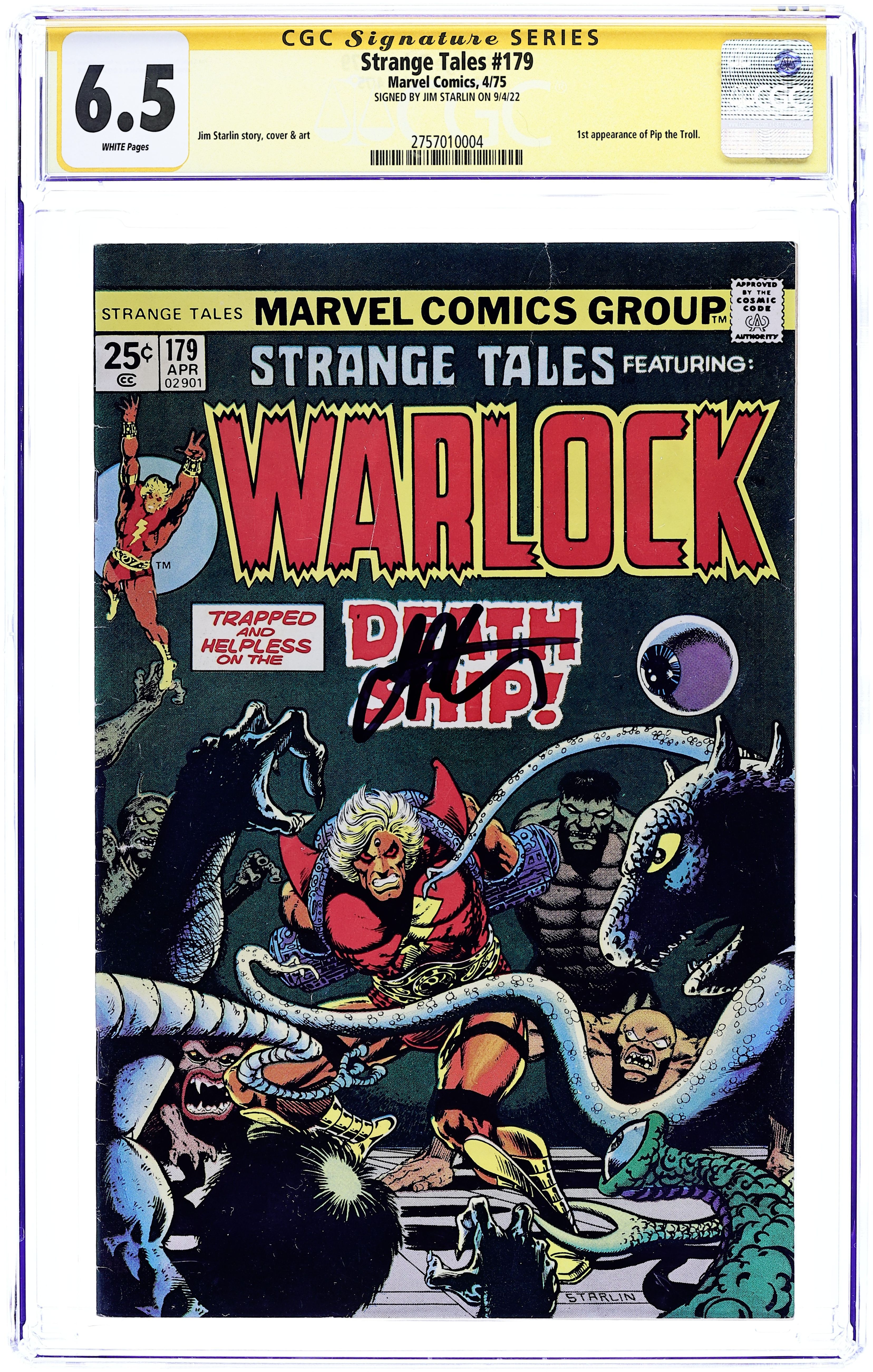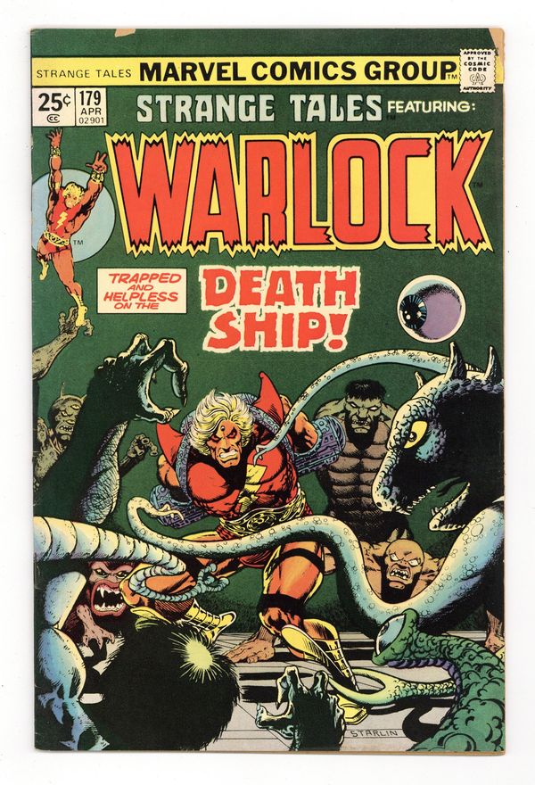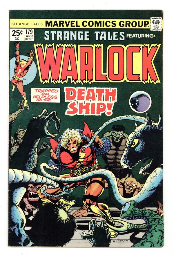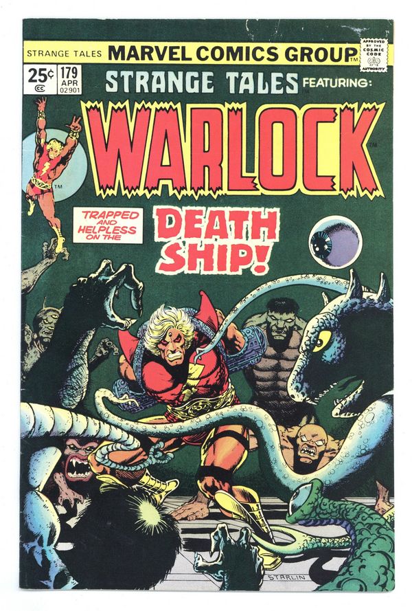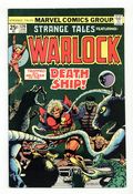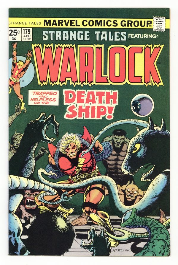 Cover art by Jim Starlin. "Death Ship!", script and art by Jim Starlin; Warlock is captured by Autolycus of the Black Knights an brought aboard Magus' Flagship; His fellow prisoners tell Warlock, that survivors of the Wars of the Church are taken as slave laborers, those who refuse will be terminated and their remains will be chemically broken down and valuable elements that can be retrieved will be used to further the cause of the Church; They also tell him, that Non-Humanoids are not considered fashioned in the Magus' image and thus must be disposed of, this also holds true for some Humanoid types—such as Trolls; First appearance of Pip the Troll. 36 pgs., full color. Cover price $0.25.