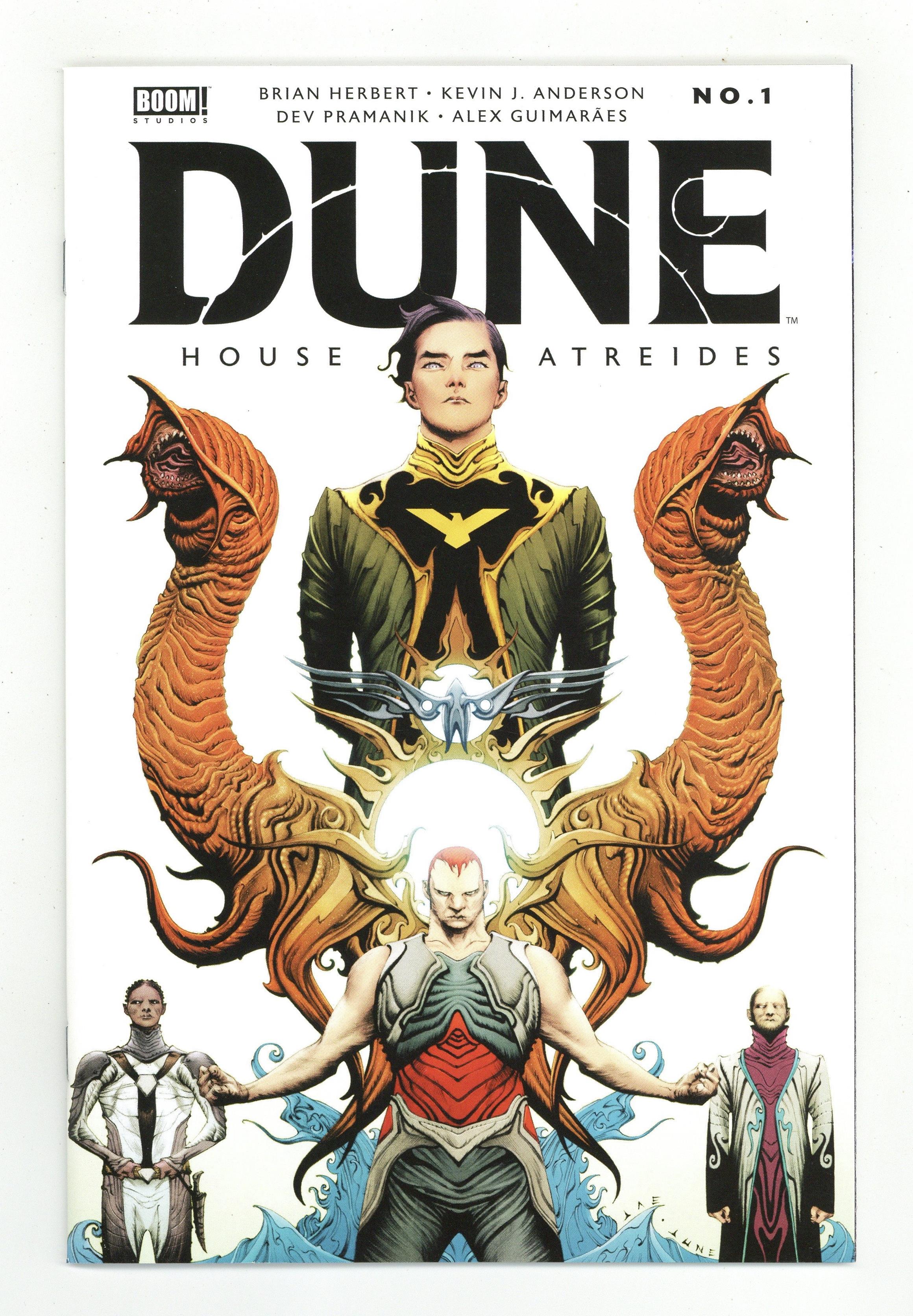 Published Oct 2020 by Boom Studios.$7.20Written by Brian Herbert and Kevin J. Anderson. Art by Dev Pramanik. Cover by Jae Lee. * Set in the years leading up the Hugo and Nebula Award-winning Dune-which inspired the upcoming feature film from Legendary Pictures- DUNE: HOUSE ATREIDES transports readers to the far future on the desert planet Arrakis where Pardot Kynes seeks its secrets. * Meanwhile, a violent coup is planned by the son of Emperor Elrood; an eight-year-old slave Duncan Idaho seeks to escape his cruel masters; and a young man named Leto Atreides begins a fateful journey. * These unlikely souls are drawn together first as renegades and then as something more, as they discover their true fate - to change the very shape of history! 32 pages, full color. Cover price $4.99.