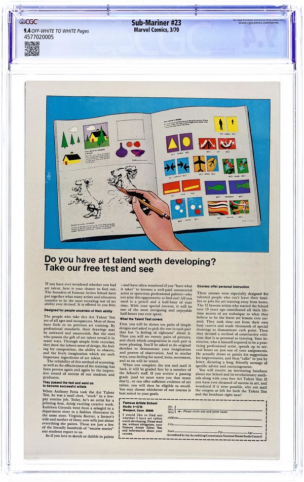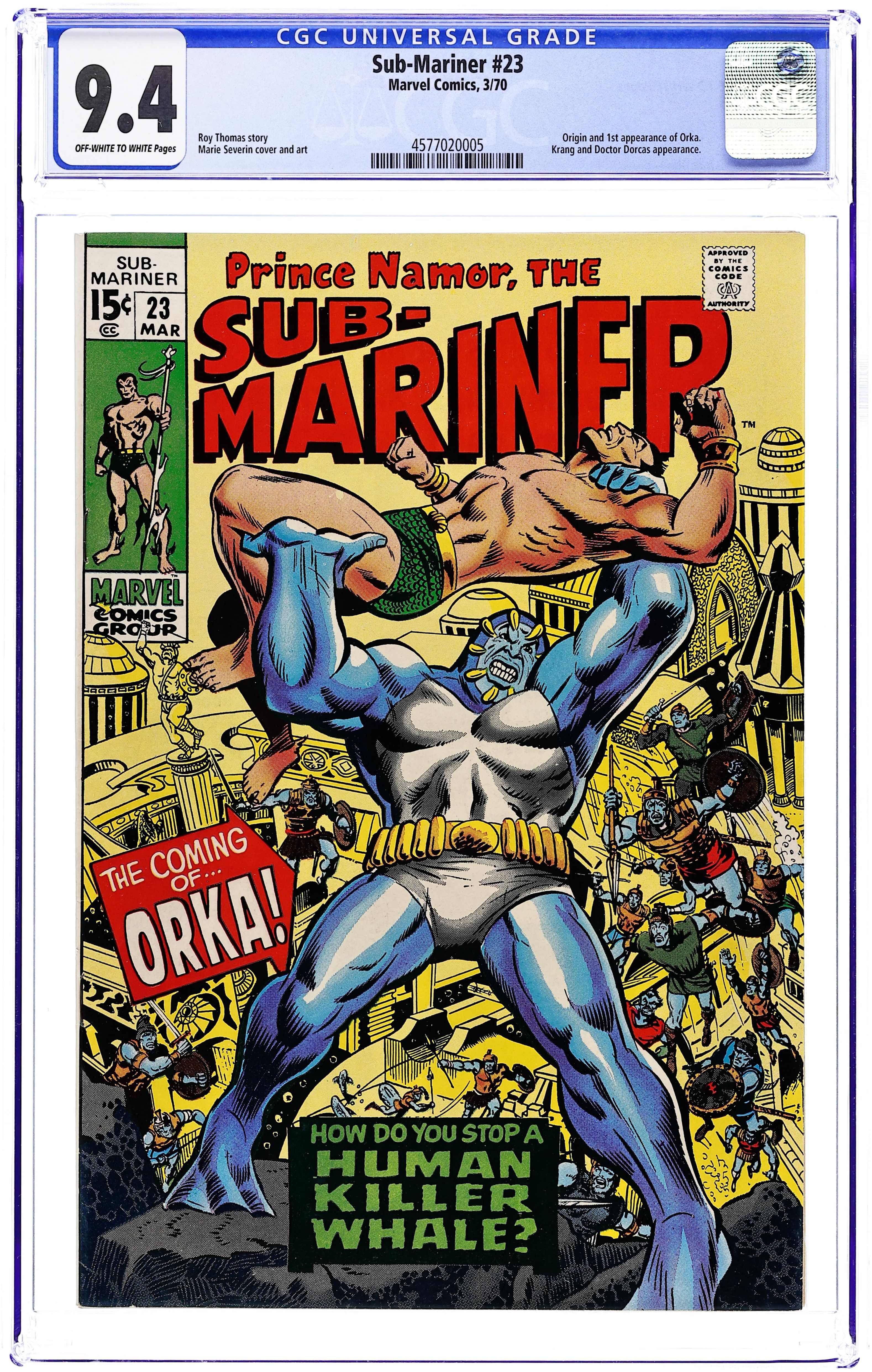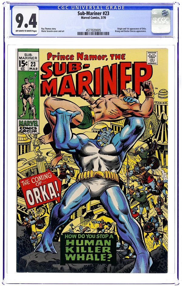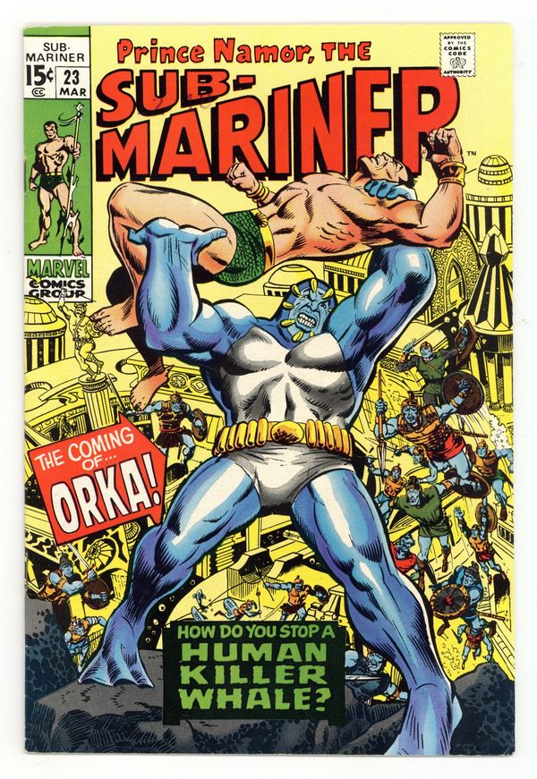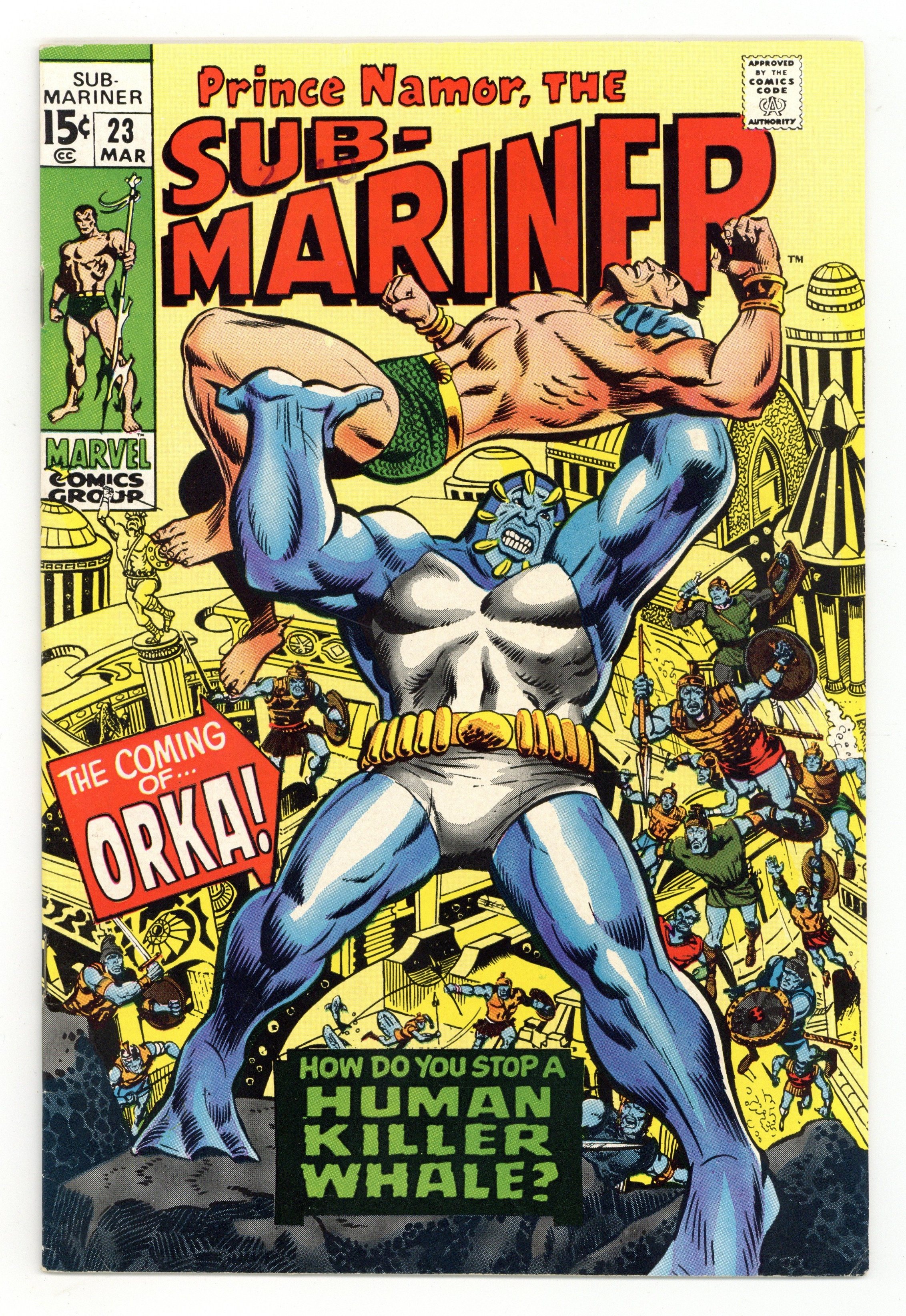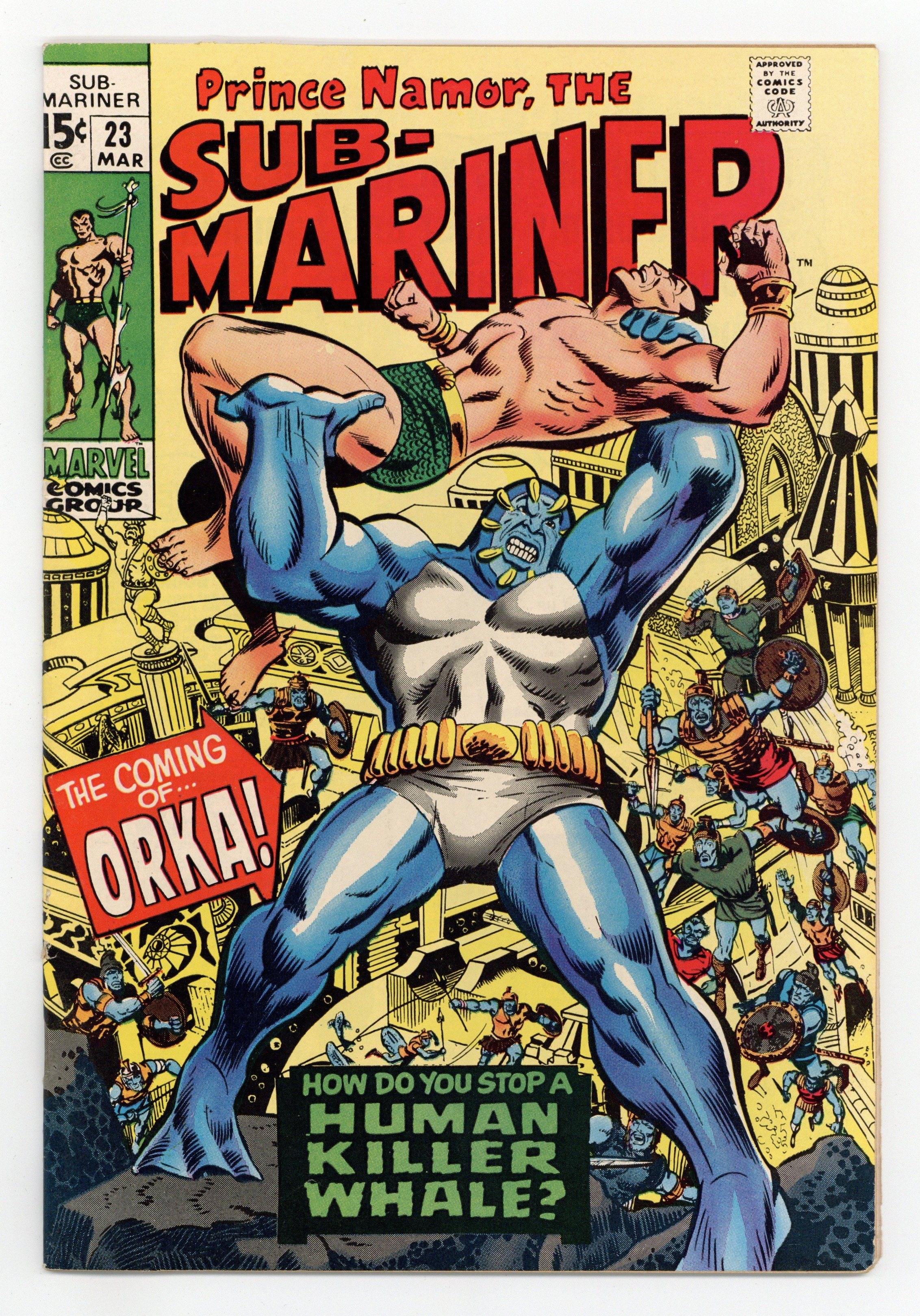 Cover pencils by Marie Severin, inks by Mike Esposito. First appearance of Orka in "The Coming of Orka," script by Roy Thomas, pencils by Marie Severin, inks by Johnny Craig; Returning to his undersea realm, Namor comes across a large herd of killer whales, led by the monstrous Orka, and takes him on; Namor is defeated by Orka, but follows him and discovers that Dr. Dorcas and Krang are actually behind Orka's powers, and are planning an attack on Atlantis; Namor gains the upper hand by threatening Krang's life which prompts Orka to turn against Dorcas; However, Namor's plan comes undone and he's taken down hard by Orka; Following Krang's orders, Orka puts a stun-collar and chains on the Sub-Mariner; Krang then announces an intention of marching into Atlantis with an enslaved Namor. 36 pgs., full color. $0.15. Cover price $0.15.