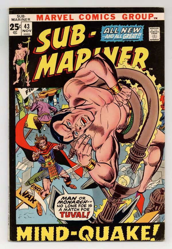 52-page giant. Cover pencils by Gil Kane, inks by Frank Giacoia. "Mindquake!", script by Gerry Conway, pencils by Gene Colan, inks by Mike Esposito; Namor, continuing his search for his father, runs into a bunch of sailors who are dumping atomic waste; He stops them and witnesses the death of a lighthouse keeper apparently under the mental influence of someone known as Tuval the Mind Master; Namor makes his way to Boston where he comes across a mysterious cult led by Tuval. Tuval turns his attention to a group of teenagers enjoying an outdoor concert and begins absorbing their youth; Namor defeats Tuval and frees those under his influence, oblivious that one of those freed is his father, Captain Mackenzie. Letter from comics editor Bob Rozakis. 52 pgs., full color. $0.25. Cover price $0.25.