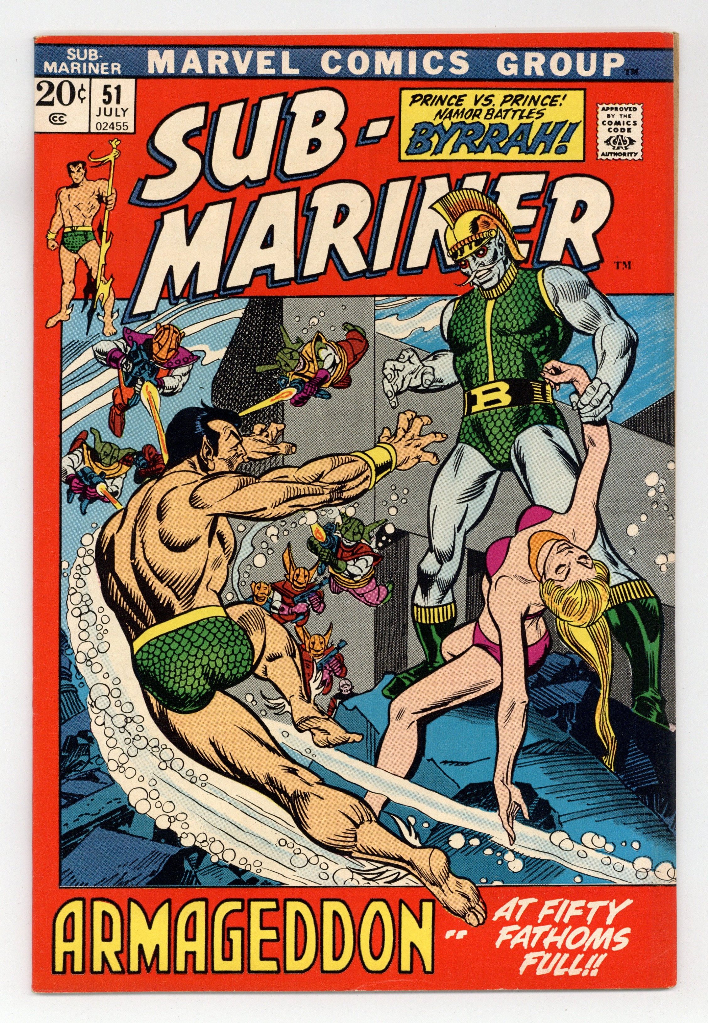 Cover pencils by Gil Kane, inks by Frank Giacoia. "Armageddon At Fifty Fathoms Full!", script by Bill Everett and Mike Friedrich, art by Bill Everett; Prince Byrrah catches up with Namor and Namorita and attacks them; Before Namor can lay his hands on Byrrah, Byrrah is whisked away by the Brother Royale of the Badoon; The Brother Royale is using Byrrah as his pawn to gain control of the south polar oil reserves; He sends Byrrah back into the battle followed by his Badoon soldiers; Realizing he's been betrayed, Byrrah helps Namor and Namorita drive back the Badoon and destroy the oil reserves; A defeated Byrrah is allowed to go on his way. 36 pgs., full color. $0.20. Cover price $0.20.