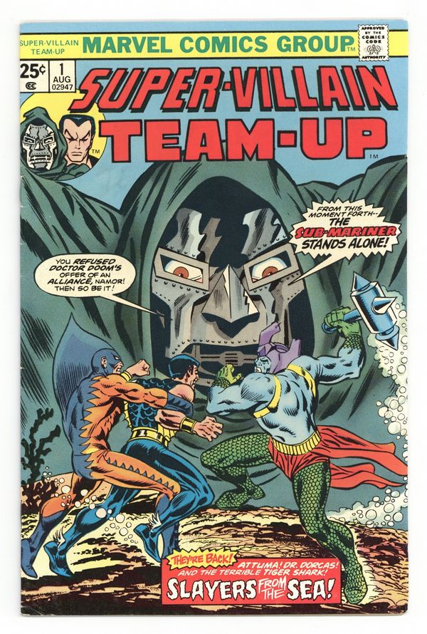 "Slayers from the Sea!" Script by Tony Isabella. Pencils by George Tuska and Bill Everett (chapter 1) and George Evans (chapter 2). Inks by Fred Kida (chapter 1) and Frank Springer (chapter 2). Cover by Ron Wilson and Frank Giacoia. Story continues from Giant-Size Super-Villain Team-Up 2. The Sub-Mariner leaves Latveria after having second thoughts about forming an alliance with Doctor Doom. Following Prince Namor's departure, the Latverian monarch realizes that he does in fact need help for his various plans of conquest and decides to reach out to the Prince of Atlantis. Meanwhile, the Sub-Mariner visits Hydro-base and is ambushed by a trio of villains: Tiger Shark, Doctor Dorcas, and Attuma! A super slugfest erupts on land and under the sea! Will the Avenging Son prevail? Flashback cameo appearances by the Fantastic Four, Daredevil, Quicksilver, Spider-Man, Thor, and the Hulk to recap Doctor Doom's previous battles through the years. (Notes: This issue features Bill Everett's last published artwork on the Sub-Mariner, the character he created in the golden age. This issue also contains a full-page ad for Hostess Twinkies featuring Captain Marvel vs. Nitro.) Cover price $0.25.