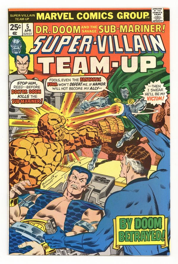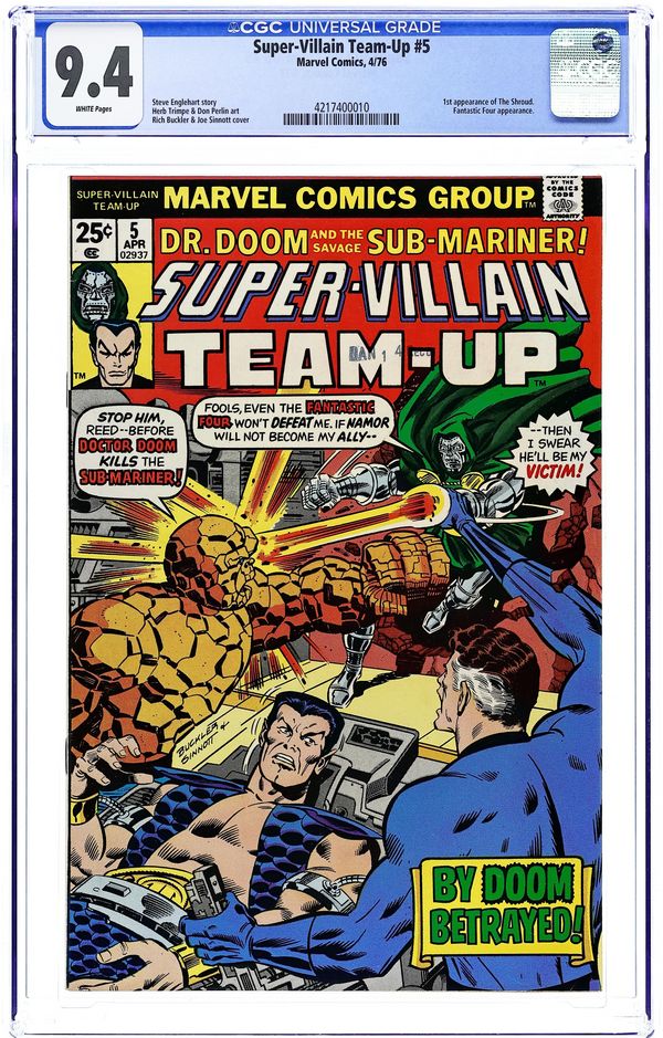 "And Be a Villain!" Guest-starring the Fantastic Four and the Shroud. Script by Steve Englehart. Pencils by Herb Trimpe. Inks by Don Perlin. Cover by Rich Buckler and Joe Sinnott. A quiet evening at the Baxter Building is disrupted by the Sub-Mariner's crashing through an upper floor window! The Prince of Atlantis is near death! What has happened to the Avenging Son? After Reed Richards provides emergency care to his erstwhile foe, Prince Namor explains. The vindictive Victor Von Doom ambushed Namor and disabled his protective suit! And now the dejected Sub-Mariner must serve Doctor Doom or else! But the Fantastic Four vow to stop their long-time adversary! Even if that means taking the battle to Latveria next issue! Meanwhile on a rooftop near the Baxter Building, the Human Torch encounters a new costumed vigilante! Is the mysterious Shroud a friend or foe? First appearance of the Shroud. Flashback cameos by Medusa and Triton. (Notes: The Sub-Mariner returns to his familiar green trunks (costume) in this issue. The letters page contains Marvel Value Stamp Series B #67 the Amazing Spider-Man. This issue includes a full-page ad for Hostess Cup Cakes featuring Mary Jane Watson and Spider-Man vs. Man-Mountain Marko. A 30-cent cover price variant exists for this issue.) 32 pages Cover price $0.25.