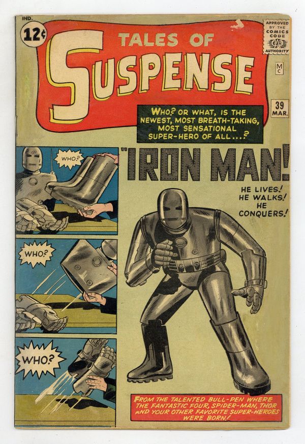 Starts Jan 3 Cover pencils by Jack Kirby, inks by Don Heck. First appearance of Iron Man in "Iron Man Is Born!", script by Stan Lee (plot) and Larry Lieber (script), art by Don Heck; Playboy industrialist and weapons designer Tony Stark is injured in Vietnam and captured by communists; While pretending to build a weapon for his captors he builds a suit of battle armor to keep his injured heart beating and uses it to escape and beat the communist commander. "The Treasure" text story. "The Last Rocket!", art by Gene Colan; When the sun starts dying humanity goes into space, except for two nature lovers; Just as the last rocket leaves a new sun flares to life, and the two remaining humans, Adam and Eve, rename the planet Earth. "Gundar!", script by Stan Lee, art by Steve Ditko; A shipwrecked man finds cursed Viking ghosts on an island, and his descent from the captain that cursed them releases them. 36 pages, full color. Cover price $0.12.