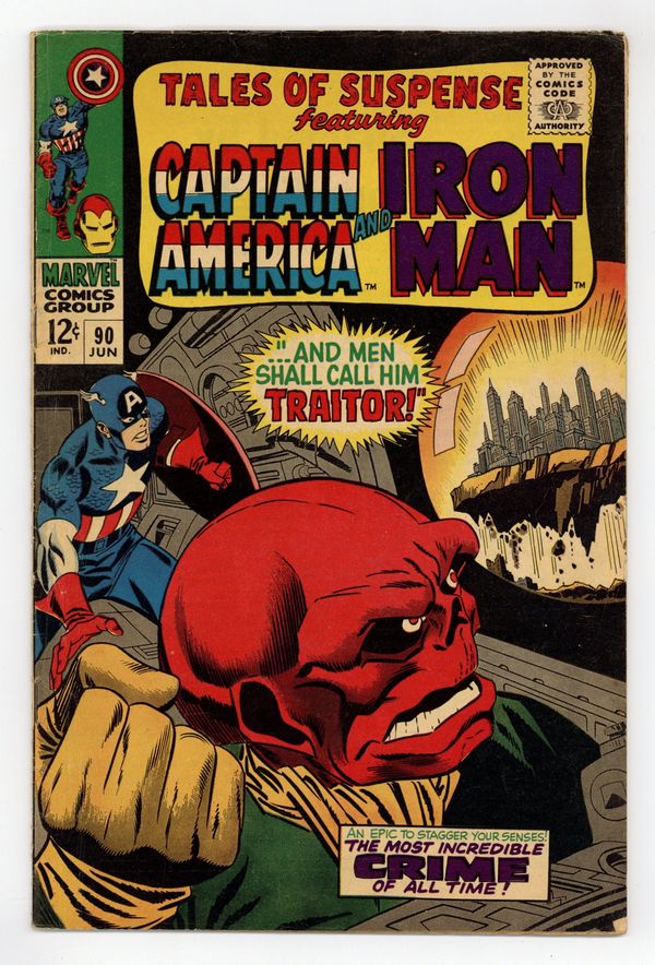 Tags: Marvel Legacy Numbering: Captain America (part 90), Marvel Legacy Numbering: Tales of Suspense (part 90), Captain America, Iron Man$22.00Cover pencils by Gene Colan, inks by Frank Giacoia. "The Golden Ghost!", script by Stan Lee, pencils by Gene Colan, inks by Frank Giacoia; Melter forces Tony Stark to improve his weapon; After he leaves Stark for dead, Tony Stark dons one of his old armors and defeats Melter. "And Men Shall Call Him Traitor!", script by Stan Lee, pencils by Gil Kane, inks by Joe Sinnott; Cap manages to escape from the Red Skull's death trap, only to find out the Skull is lifting Manhattan into the sky; The only way Cap can save the island is by pledging to do the Skull's bidding for 24 hours. 36 pgs., full color. $0.12. Cover price $0.12.