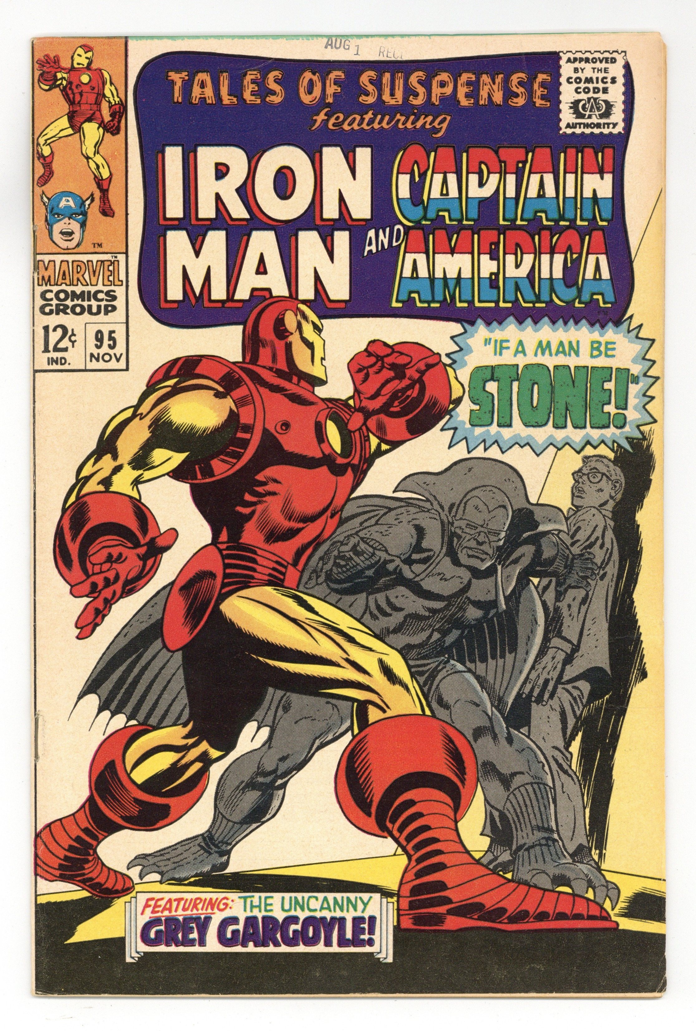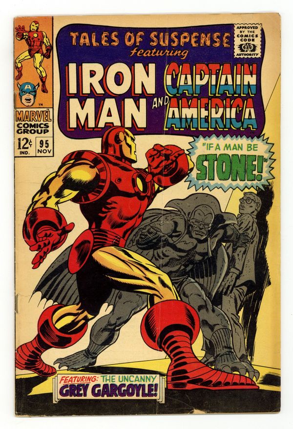 Tags: Marvel Legacy Numbering: Captain America (part 95), Marvel Legacy Numbering: Tales of Suspense (part 95), Captain America, Iron Man$23.00Cover pencils by Gene Colan, inks by Frank Giacoia. "If A Man Be Stone!", script by Stan Lee, pencils by Gene Colan, inks by Frank Giacoia; Tony Stark discovers that his factory has been broken into while he was in Vietnam; The culprit is a young SHIELD agent named Jasper Sitwell; Sitwell explains that Nick Fury has assigned him to guard Stark's factory because it makes many of SHIELD's devices; The Grey Gargoyle breaks into Stark Industries, turning guards to stone. "A Time to Die - A Time to Live!", script by Stan Lee, pencils by Jack Kirby, inks by Joe Sinnott; Captain America searches for a fugitive gang leader; He thinks about how this is going to be his last mission, and theres a flashback that shows Steve Rogers getting a call from SHIELD Agent 13 that he likes; Cap reveals his identity as Steve Rogers; Steve thanks Tony Stark for everything he did for the Avengers. Ad for Merry Marvel Marching Society. 36 pages, full color. Cover price $0.12.