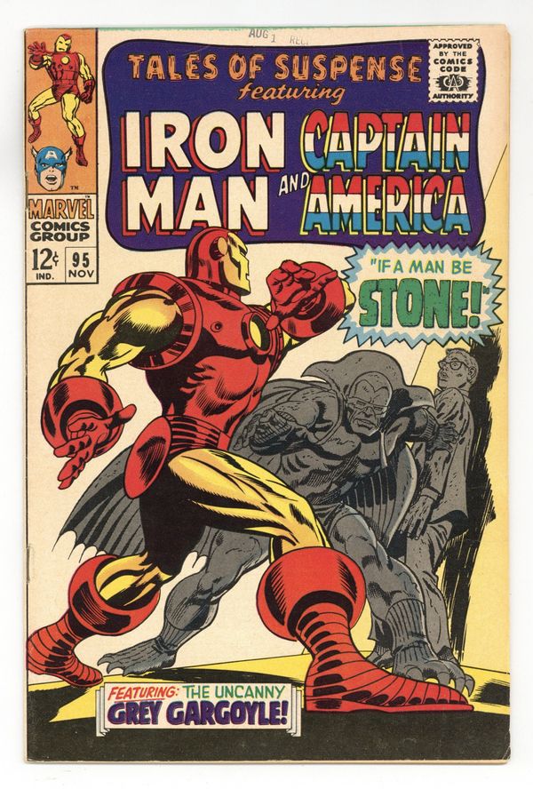 Tags: Marvel Legacy Numbering: Captain America (part 95), Marvel Legacy Numbering: Tales of Suspense (part 95), Captain America, Iron Man$12.25Cover pencils by Gene Colan, inks by Frank Giacoia. "If A Man Be Stone!", script by Stan Lee, pencils by Gene Colan, inks by Frank Giacoia; Tony Stark discovers that his factory has been broken into while he was in Vietnam; The culprit is a young SHIELD agent named Jasper Sitwell; Sitwell explains that Nick Fury has assigned him to guard Stark's factory because it makes many of SHIELD's devices; The Grey Gargoyle breaks into Stark Industries, turning guards to stone. "A Time to Die - A Time to Live!", script by Stan Lee, pencils by Jack Kirby, inks by Joe Sinnott; Captain America searches for a fugitive gang leader; He thinks about how this is going to be his last mission, and theres a flashback that shows Steve Rogers getting a call from SHIELD Agent 13 that he likes; Cap reveals his identity as Steve Rogers; Steve thanks Tony Stark for everything he did for the Avengers. Ad for Merry Marvel Marching Society. 36 pages, full color. Cover price $0.12.