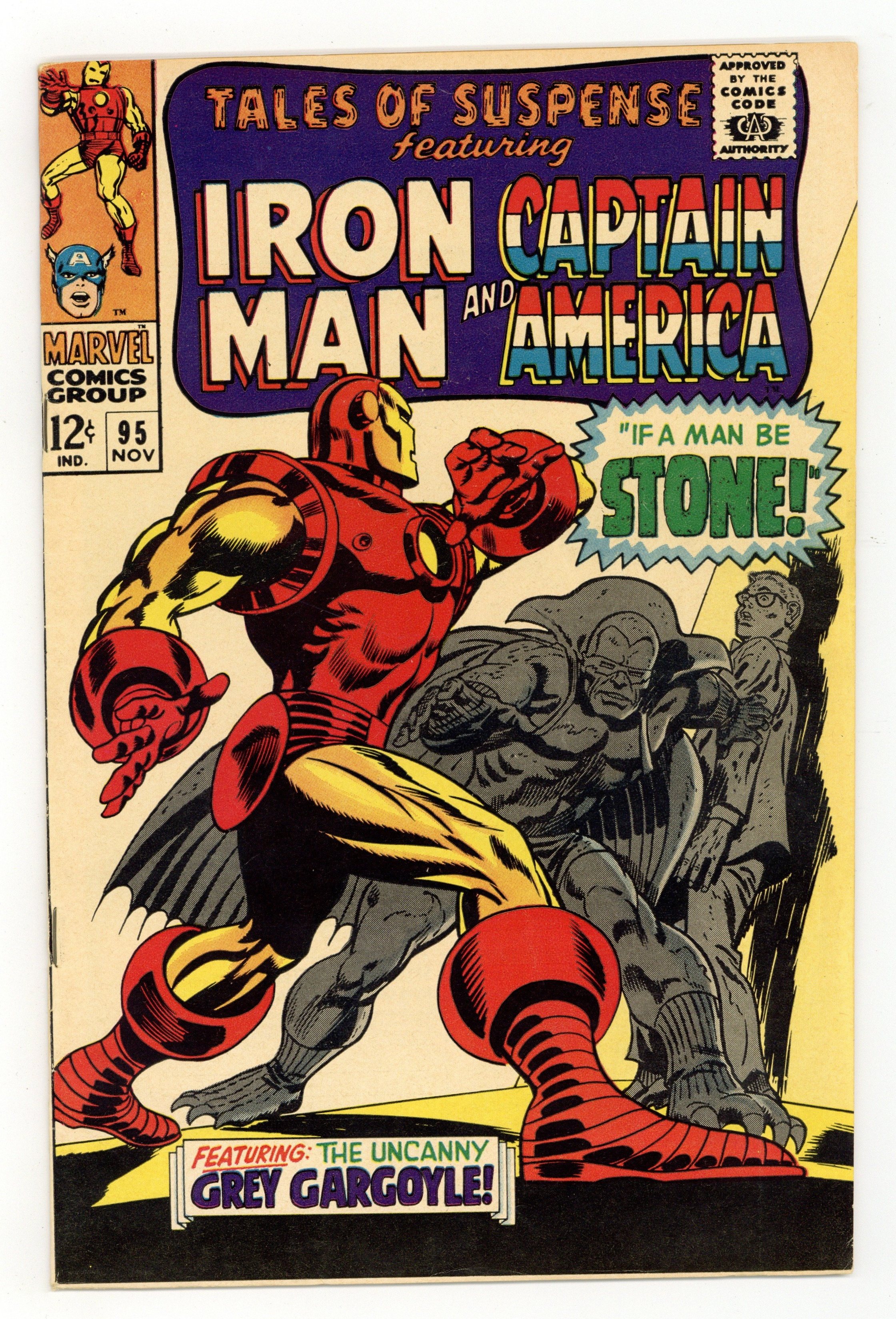 Cover pencils by Gene Colan, inks by Frank Giacoia. "If A Man Be Stone!", script by Stan Lee, pencils by Gene Colan, inks by Frank Giacoia; Tony Stark discovers that his factory has been broken into while he was in Vietnam; The culprit is a young SHIELD agent named Jasper Sitwell; Sitwell explains that Nick Fury has assigned him to guard Stark's factory because it makes many of SHIELD's devices; The Grey Gargoyle breaks into Stark Industries, turning guards to stone. "A Time to Die - A Time to Live!", script by Stan Lee, pencils by Jack Kirby, inks by Joe Sinnott; Captain America searches for a fugitive gang leader; He thinks about how this is going to be his last mission, and theres a flashback that shows Steve Rogers getting a call from SHIELD Agent 13 that he likes; Cap reveals his identity as Steve Rogers; Steve thanks Tony Stark for everything he did for the Avengers. Ad for Merry Marvel Marching Society. 36 pages, full color. Cover price $0.12.