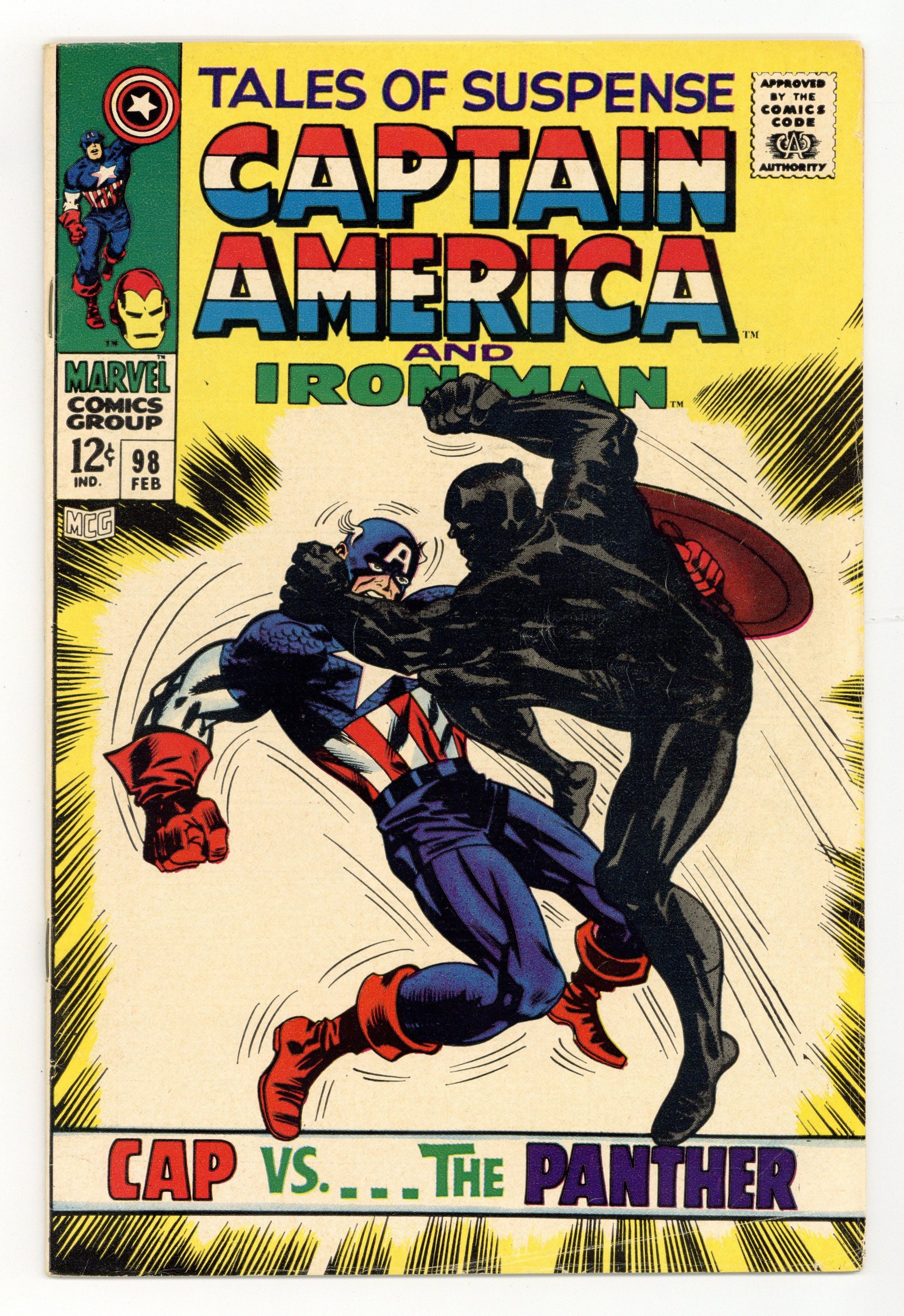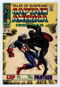 Tags: Marvel Legacy Numbering: Captain America (part 98), Marvel Legacy Numbering: Tales of Suspense (part 98), Black Panther, Captain America, Iron Man$40.00Cover pencils by Jack Kirby, inks by Frank Giacoia. "The Claws of the Panther!", script by Stan Lee, pencils by Jack Kirby, inks by Joe Sinnott; Captain America and Black Panther join forces to combat the henchmen of Baron Zemo. "The Warrior and the Whip!", script by Stan Lee, pencils by Gene Colan, inks by Frank Giacoia; Iron Man creates holograms of himself to confuse Whiplash during their battle; Jasper Sitwell has searches for Tony Stark at Stark Industries; He discovers that Morgan Stark took Iron Man away. Letter from comics writer Bob Gale. 36 pages, full color. Cover price $0.12.