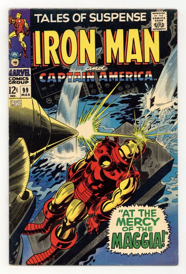 Final issue. Cover pencils by Gene Colan, inks by Frank Giacoia. "At the Mercy of the Maggia," script by Archie Goodwin, pencils by Gene Colan, inks by Johnny Craig; At the risk of putting greater strain on his heart Iron Man fires a repulsor ray at Whiplash; Jasper Sitwell searches for Iron Man after Tony Stark's cousin Morgan kidnapped him and took him to the Maggia; Nick Fury appearance; The story continues in Iron Man & Sub-Mariner #1. "The Man Who Lived Twice!", script by Stan Lee, pencils by Jack Kirby, inks by Syd Shores; Captain America and Black Panther continue their fight against Baron Zemo and his men; The story continues in Captain America #100. Letter to the editor from comic and book distributor Bud Plant. 36 pages, full color. Cover price $0.12.