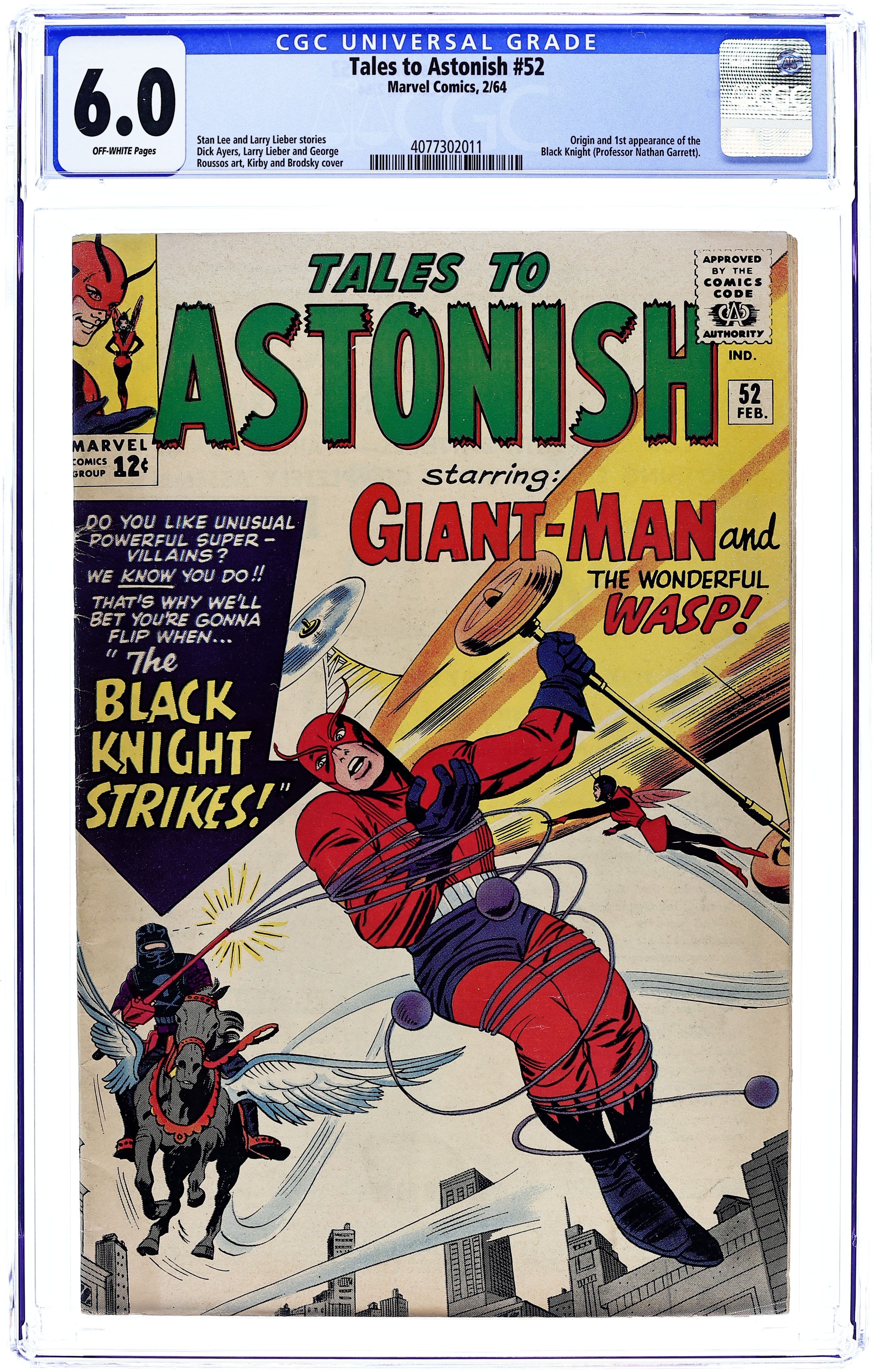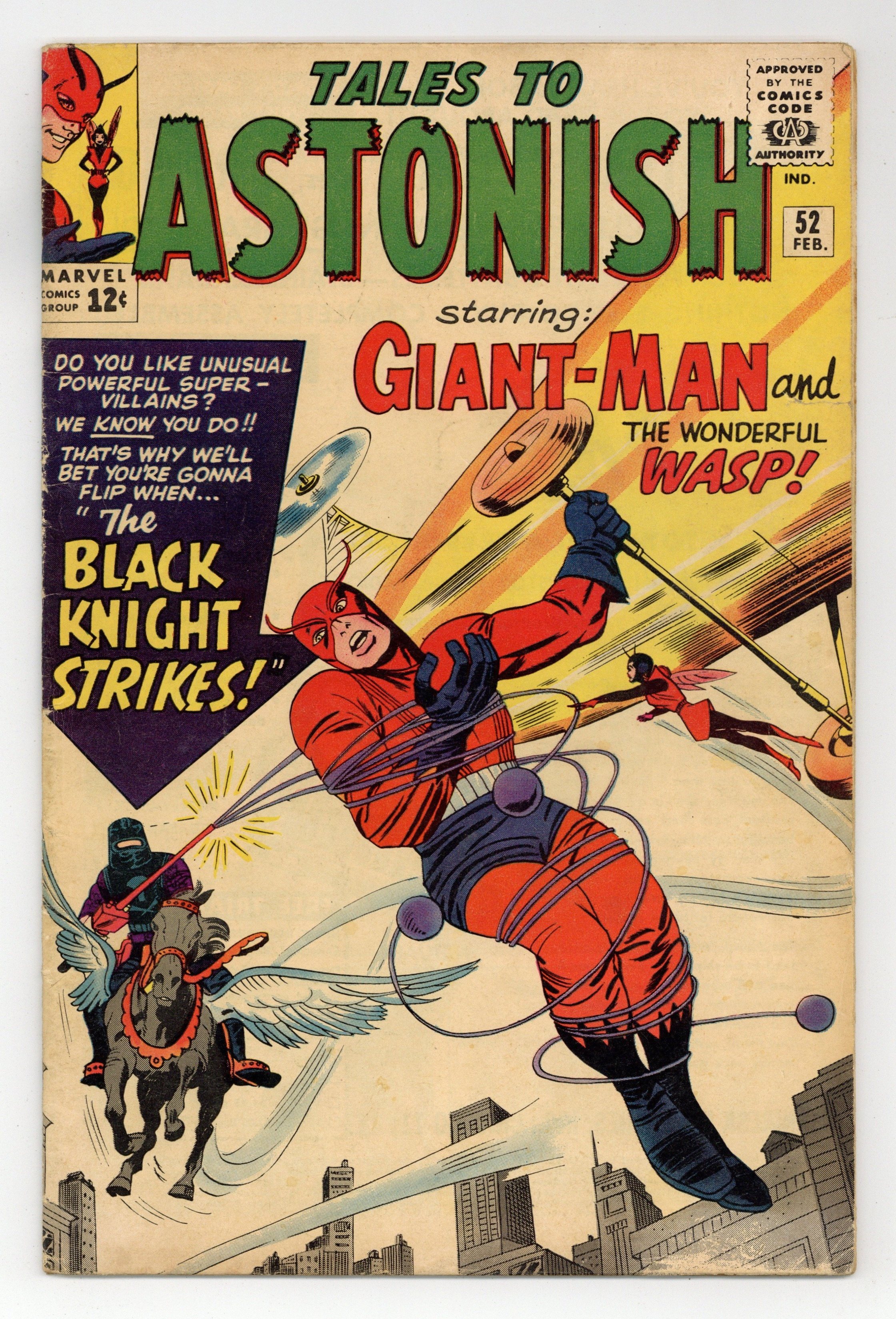 Starts Jan 3 Cover by Jack Kirby and Sol Brodsky. The Black Knight Strikes!, script by Stan Lee, art by Dick Ayers; After being arrested for treason by Giant-Man, Professor Garrett flees to Europe where he manipulate the genes of horses and eagles to create a winged horse. X-Men #3 ad, art by Jack Kirby and Sol Brodsky. Avengers #3 ad, art by Jack Kirby and Paul Reinman. Not What They Seem!, script by Stan Lee and Larry Lieber, art by Larry Lieber and George Roussos [as G. Bell]; The Wasp tells the tale of prison escapees who try to avoid a planet with a trap, but are doomed when they take the wrong side in a battle of the sexes. 36 pgs., full color. $0.12. Cover price $0.12.