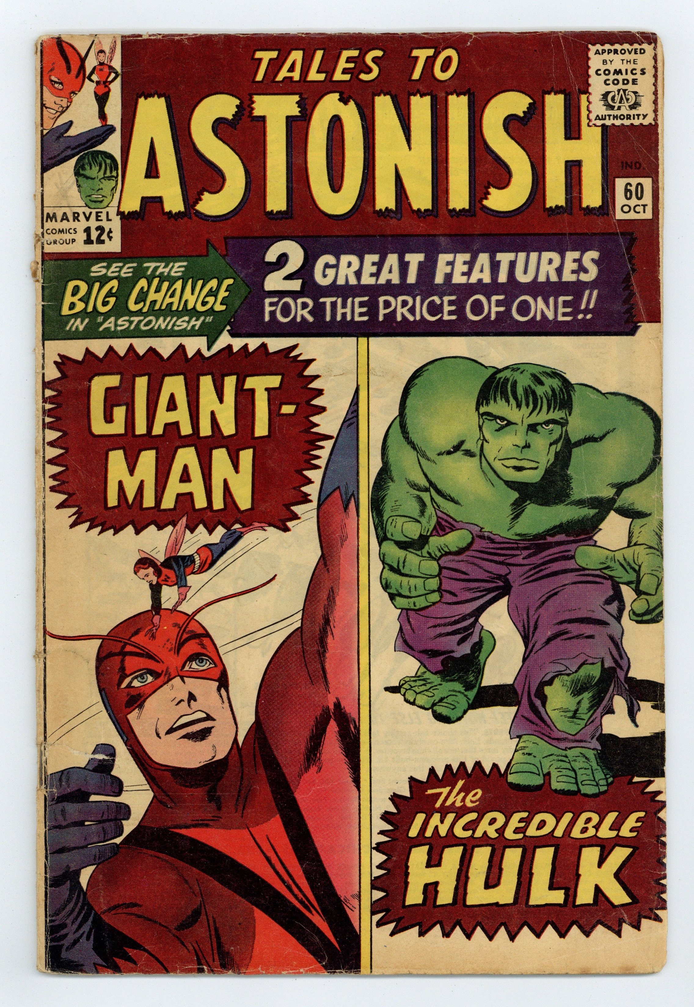 Cover by Jack Kirby and Sol Brodsky. The Beasts of Berlin!, script by Stan Lee, art by Dick Ayers and Paul Reinman; When Henry learns that an old buddy has been captured behind the Iron Curtain, he heads off to East Berlin to mount a rescue; Using both the powers of Giant-Man and Ant-Man Hank rescues Lee and destroys the ray the reds are using to create hyper-intelligent gorillas. The Incredible Hulk, script by Stan Lee, art by Steve Ditko and George Roussos (as George Bell); Bruce creates an indestructible robot which is able to withstand the power of a nuclear blast but the stress of completing it on schedule causes him to transform into the Hulk and he leaves this massive weapon of awesome power unattended; So of course, a foreign spy who has been hanging around gamma base looking for just such an opportunity jumps into the robot and takes off. Story continues from Incredible Hulk #6 but with significant changes. 36 pgs., full color. Cover price $0.12.