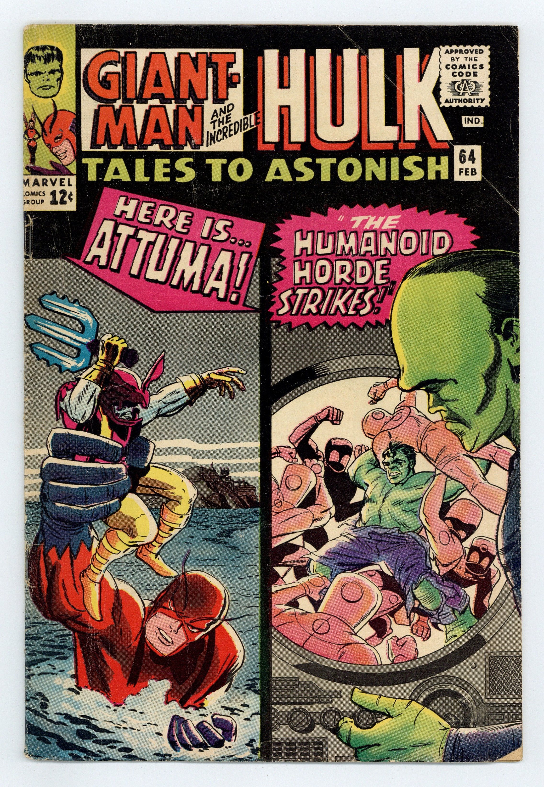 Cover by Jack Kirby and Dick Ayers. When Attuma Strikes!, script by Leon Lazarus, art by Carl Burgos and Paul Reinman; When Hank snaps at Jan for making a clumsy error during an experiment, she tearfully decides to get away from his abuse and take a trip; When her plane is captured in Attuma's latest bid for surface world conquest, a remorseful Giant-Man comes to the rescue. The Horde of Humanoids!, script by Stan Lee, art by Steve Ditko and George Roussos (as George Bell); Banner has been jailed as a traitor and is popping tranquilizers to keep himself from turning into the Hulk; Rick goes right to the commander in chief to tell the prez Banner's secret and to ask for his release; Much to Talbot's chagrin, the president orders Bruce's release and the two are sent to Astra Island to oversee testing of Banner's absorbatron which has the power to soak up a nuclear blast. 36 pgs., full color. $0.12. Cover price $0.12.