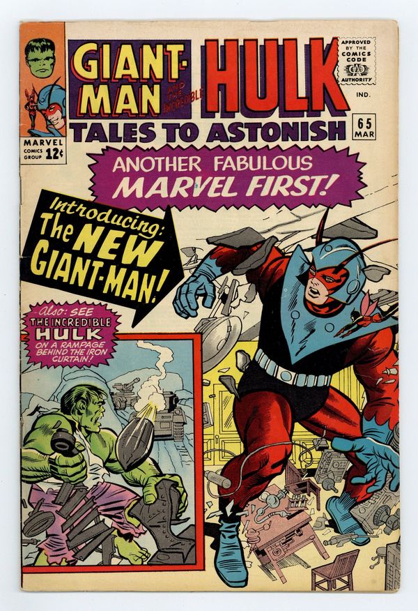 Tags: Marvel Legacy Numbering: Hulk (part 65), Hulk$34.00Cover by Jack Kirby and Chic Stone. The New Giant-Man, script by Stan Lee, art by Bob Powell and Don Heck; When Hank designs a new power to add to his Giant-Man repertoire (the ability to grow and shrink things other than himself at will), Jan decides it is high time to create a new costume for him as well. On the Rampage Against the Reds!, script by Stan Lee, art by Steve Ditko and Dick Ayers; In a pitched battle with the Humanoids, the Hulk and his foes fall into the ocean where the jade giant transforms back into Banner and is promptly captured by a Russian sub; Bruce is told he will be forced to work for the commies but instead he turns back into the Hulk and escapes; The Russians chase him down with a proton gun. 36 pgs., full color. $0.12. Cover price $0.12.