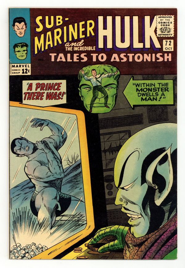 Cover by Gene Colan, Jack Kirby, and Vince Colletta. A Prince There Was!, script by Stan Lee, art by Gene Colan (as Adam Austin) and Vince Colletta; Sub-Mariner continues his quest for The Trident of Neptune. Sub-Mariner escapes a seaweed menace only to succumb to the stupifying brilliance of the Diamonds of Doom; Back in Atlantis, Krang is fed up with Lady Dorma rebuffing his advances and has her teleported into exile to the land of the Faceless Ones. Within the Monster Dwells a Man!, script by Stan Lee, art by Jack Kirby and Mike Esposito; The Hulk finally agrees to follow the Leader and the big brained one teleports him out just as Ross destroys Banner's old underground complex; The Leader and the Hulk get to know each other a little better but the jade giant struggles with trying not to change back to Banner as he is still plagued with a bullet in his head that would kill his alter ego. 36 pgs., full color. $0.12. Cover price $0.12.