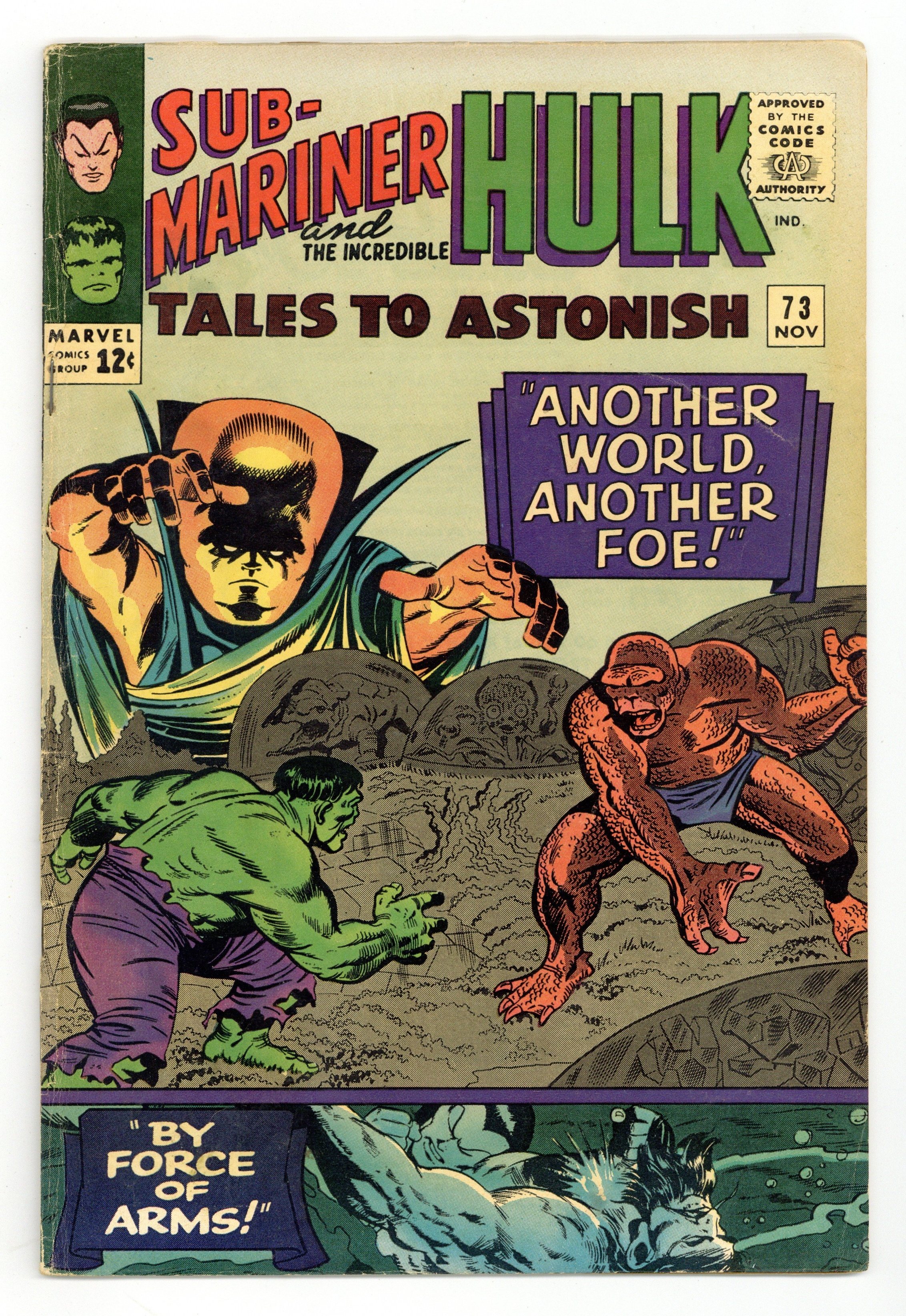 Cover by Jack Kirby, Gene Colan, Mike Esposito, and Vince Colletta. By Force of Arms!, script by Stan Lee, art by Gene Colan (as Adam Austin) and Vince Colletta; Neptune sends a group of electric eels to help Namor defeat the Demon of the Diamonds; Learning that Dorma has been exiled to the land of the Faceless Ones, Namor heads off to rescue her; Back in Atlantis, the citizens begin an active revolt against Krang. Another World, Another Foe!, script by Stan Lee, art by Jack Kirby, Bob Powell, and Mike Esposito; Discovering the bullet that is lodged in the Hulk's brain, the Leader dissolves it with a laser and bathes our hero with gamma rays to give him strength; The Hulk still has Banner's mind but can no longer transform into human form thanks to the extra blast of radiation. 36 pgs., full color. $0.12. Cover price $0.12.