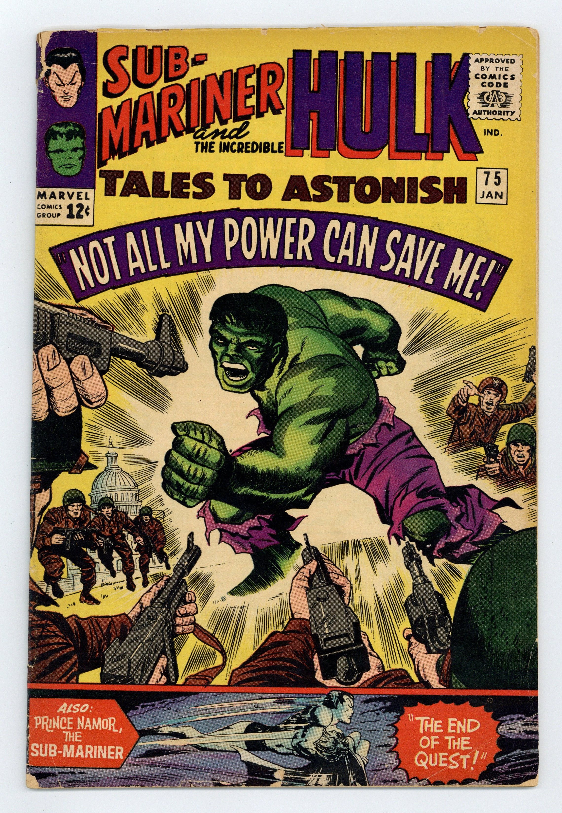 Cover by Jack Kirby, Gene Colan, Sol Brodsky, and Vince Colletta. The End of the Quest!, script by Stan Lee, art by Gene Colan (as Adam Austin) and Vince Colletta; Prince Namor returns to Atlantis to save Dorma and battle Krang. Not All My Power Can Save Me!, script by Stan Lee, art by Jack Kirby and Mike Esposito (as Mickey Demeo); With the Leader dead, the Hulk uses the Watcher's ultimate machine on himself and its only effect is to let him know that Rick has once again been captured by the miltary so they can learn the connection between Bruce Banner and the Hulk; Leaping to the rescue, Hulk is zapped by the t-gun which propels him into the future. 36 pgs., full color. $0.12. Cover price $0.12.