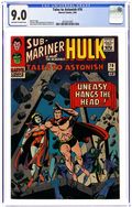$25.50Cover by Gene Colan and Vince Colletta. Uneasy Hangs the Head..!, script by Stan Lee, art by Gene Colan (as Adam Austin) and Vince Colletta; Namor defeats Krang, reclaims the throne of Atlantis and has Krang exiled. I, Against a World!, script by Stan Lee, art by Jack Kirby, Gil Kane (as Scott Edward) and Mike Esposito (as Mickey Demeo): The Hulk has been zapped into the future by the t-gun and fights with King Arrkam's forces before he is finally overcome; Once he regains consciousness, Arrkam asks his help in fighting "The Evil One" who turns out to be none other than the Executioner. 36 pgs., full color. $0.12. Cover price $0.12.