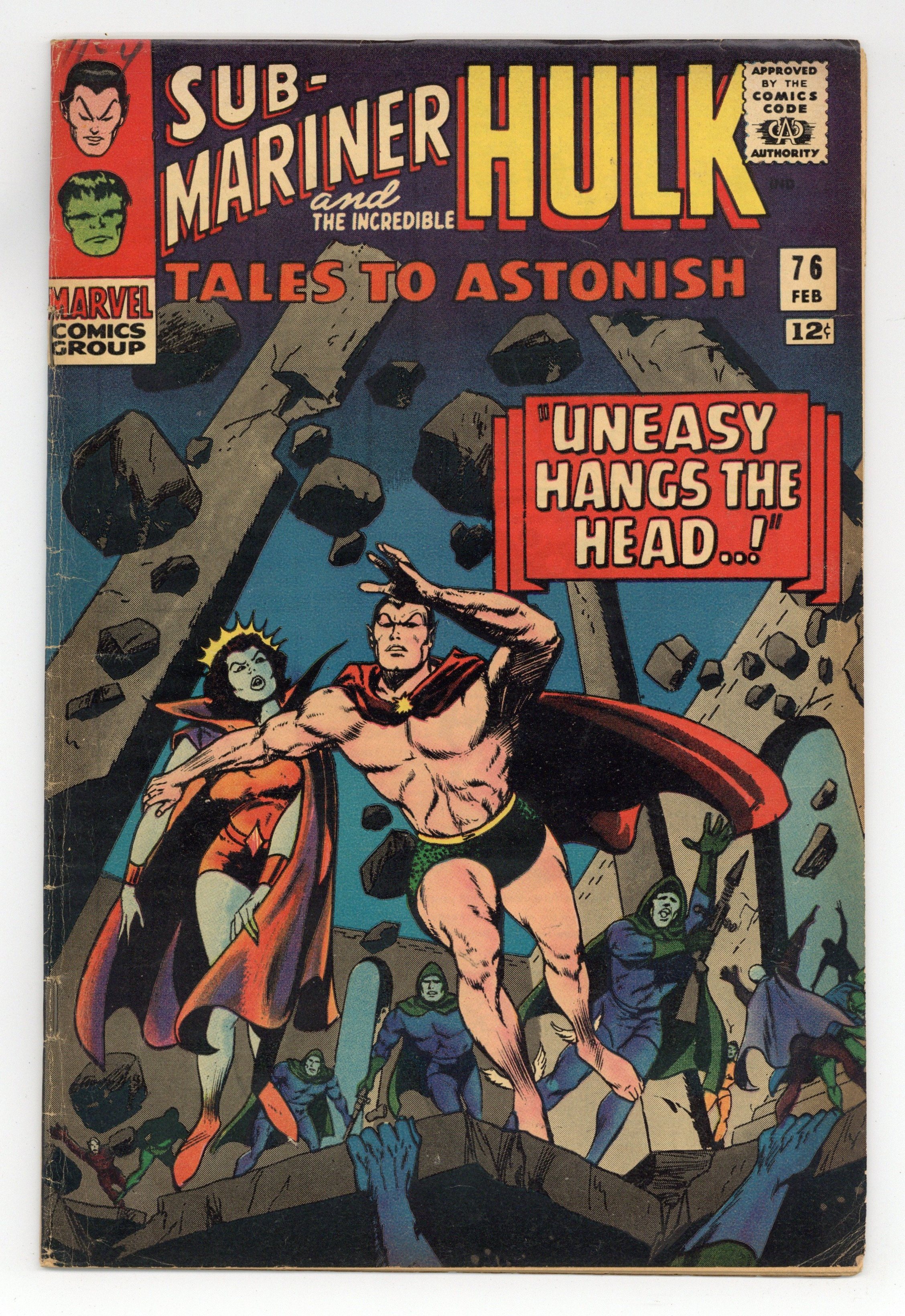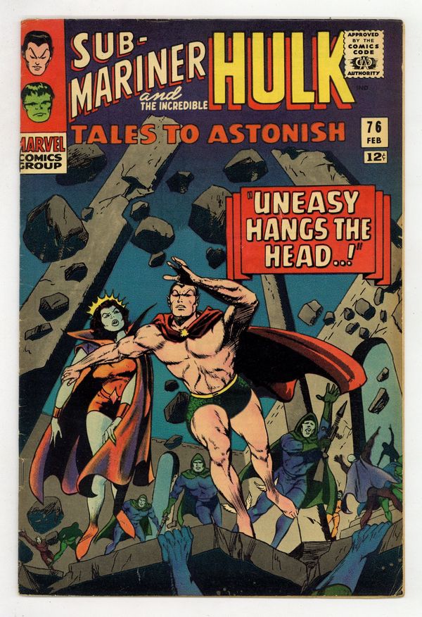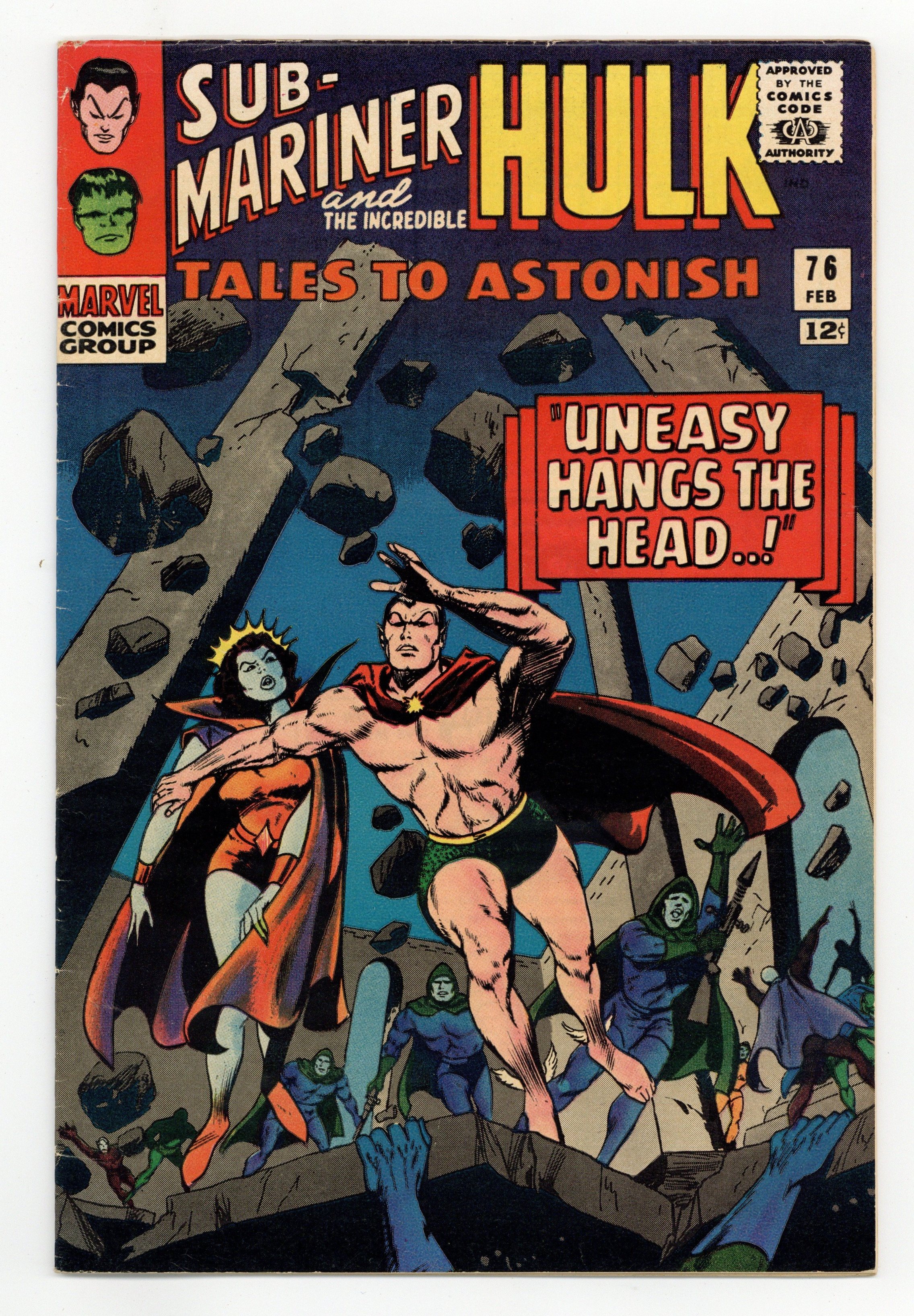Cover by Gene Colan and Vince Colletta. Uneasy Hangs the Head..!, script by Stan Lee, art by Gene Colan (as Adam Austin) and Vince Colletta; Namor defeats Krang, reclaims the throne of Atlantis and has Krang exiled. I, Against a World!, script by Stan Lee, art by Jack Kirby, Gil Kane (as Scott Edward) and Mike Esposito (as Mickey Demeo): The Hulk has been zapped into the future by the t-gun and fights with King Arrkam's forces before he is finally overcome; Once he regains consciousness, Arrkam asks his help in fighting "The Evil One" who turns out to be none other than the Executioner. 36 pgs., full color. $0.12. Cover price $0.12.