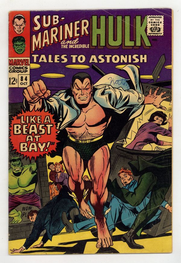 $13.25Cover by Gene Colan and Dick Ayers. Like a Beast at Bay!, script by Stan Lee, art by Gene Colan and Dick Ayers; Namor has lost his memory and the Leader of the Secret Empire convinces him to track down and kill the Hulk; As Namor rushes around New York looking for the jade giant, he is zapped by a ray from Krang which only succeeds in restoring his memory. Rampage in the City!, script by Stan Lee, art by Bill Everett, Jerry Grandenetti, Gene Colan, Bill Everett, and Dick Ayers; Finding gamma base deserted and everybody gone, the Hulk heads to New York City to try and find his old friends in the Avengers but finds himself attacked once again by city police; Rick, hearing that the Hulk is in the big apple, gets a job driving a car to New York for a mysterious stranger who tells him to be sure not to look in the trunk. 36 pgs., full color. $0.12. Cover price $0.12.