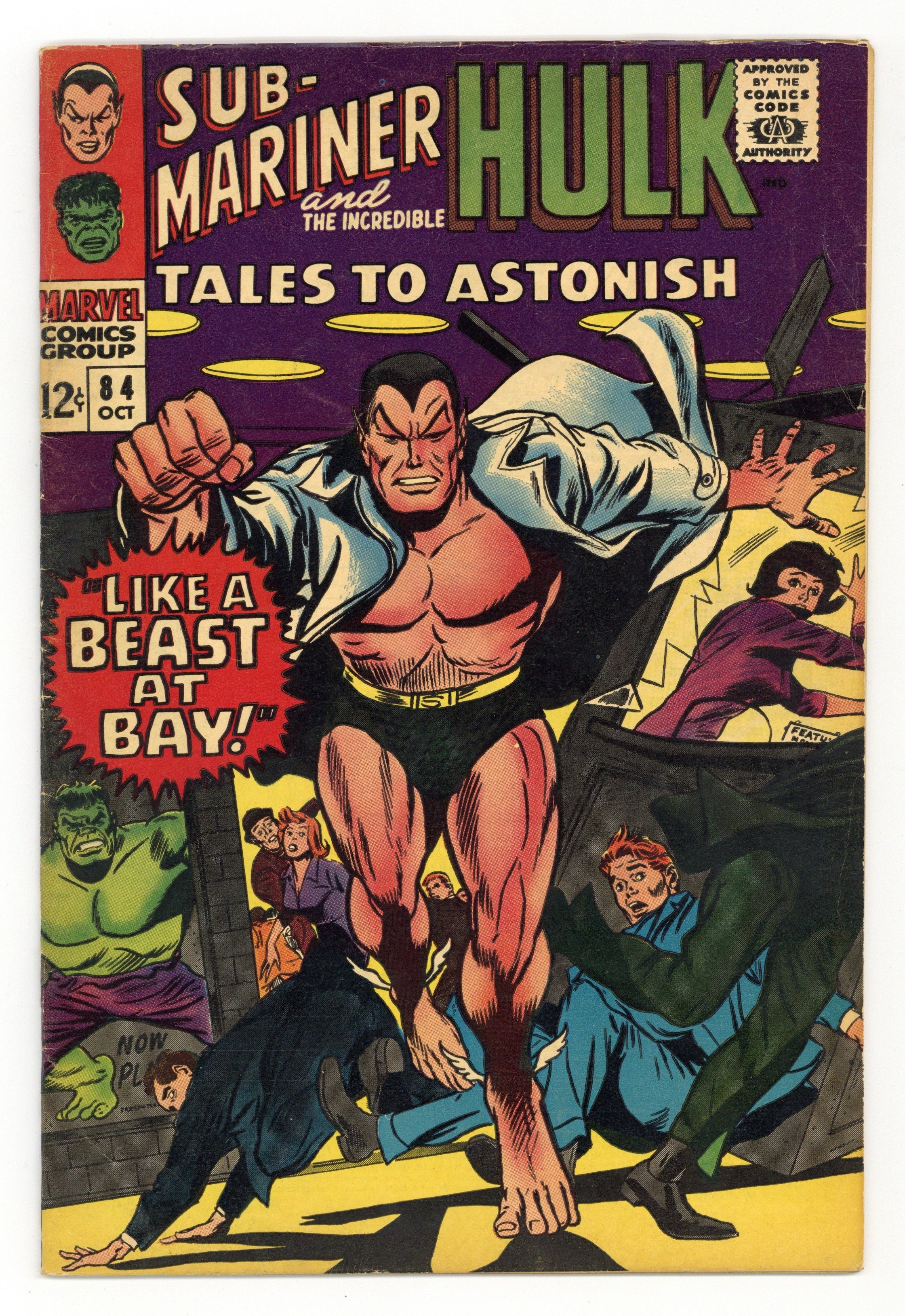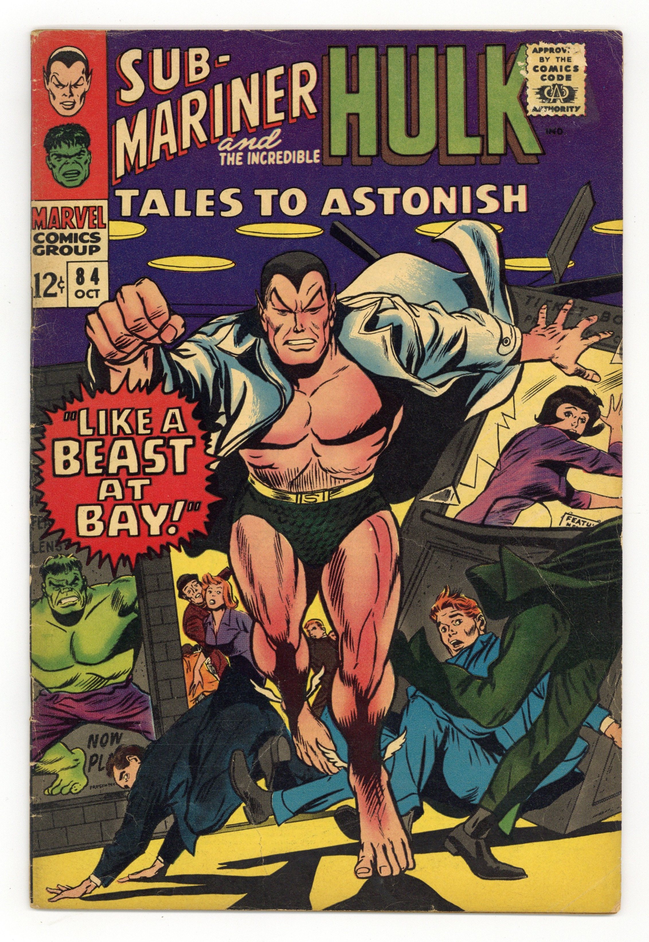Cover by Gene Colan and Dick Ayers. Like a Beast at Bay!, script by Stan Lee, art by Gene Colan and Dick Ayers; Namor has lost his memory and the Leader of the Secret Empire convinces him to track down and kill the Hulk; As Namor rushes around New York looking for the jade giant, he is zapped by a ray from Krang which only succeeds in restoring his memory. Rampage in the City!, script by Stan Lee, art by Bill Everett, Jerry Grandenetti, Gene Colan, Bill Everett, and Dick Ayers; Finding gamma base deserted and everybody gone, the Hulk heads to New York City to try and find his old friends in the Avengers but finds himself attacked once again by city police; Rick, hearing that the Hulk is in the big apple, gets a job driving a car to New York for a mysterious stranger who tells him to be sure not to look in the trunk. 36 pgs., full color. $0.12. Cover price $0.12.