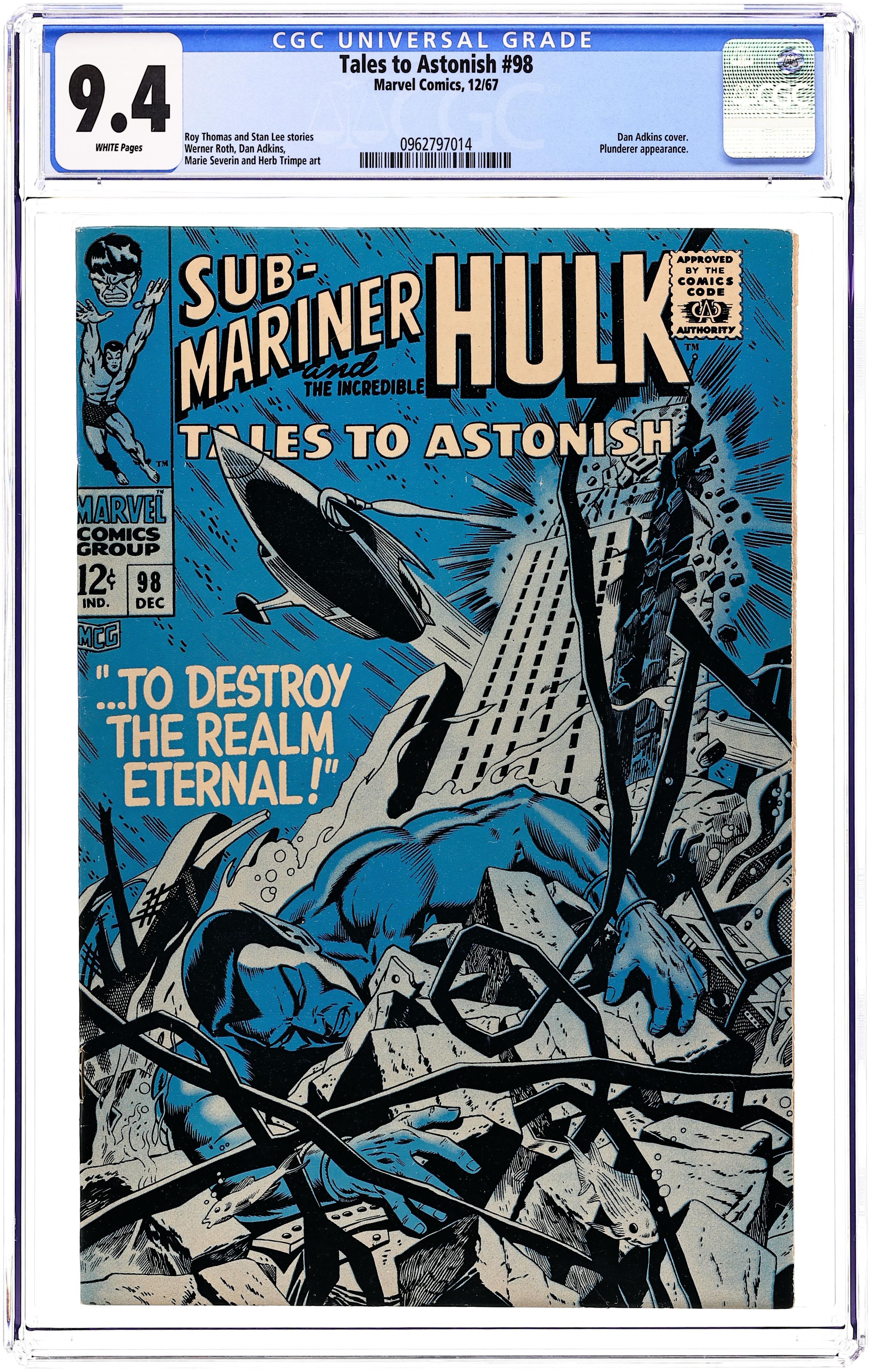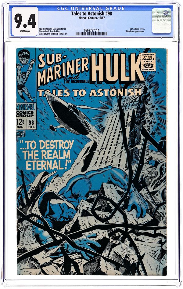 Cover by Dan Adkins. To Destroy the Realm Eternal!, script by Roy Thomas, art by Werner Roth and Dan Adkins; Namor returns to Atlantis only to find it under attack by the Plunderer; As the two parties clash, an American sub overhead senses the vibrations and begins to drop depth charges in case it is the Sub-Mariner intent on attacking them; The charges not only take out the Plunderer's sub but also destroy much of the city of Atlantis. The Puppet and the Power!, script by Stan Lee, art by Marie Severin and Herb Trimpe; Brainwashed into thinking that the Living Ligtning members are his friends, Hulk attacks his old enemy Ross and while the military is busy taking on the jade giant, the Lord of the Living Lightning takes over Thunderbolt's base. 36 pgs., full color. $0.12. Cover price $0.12.