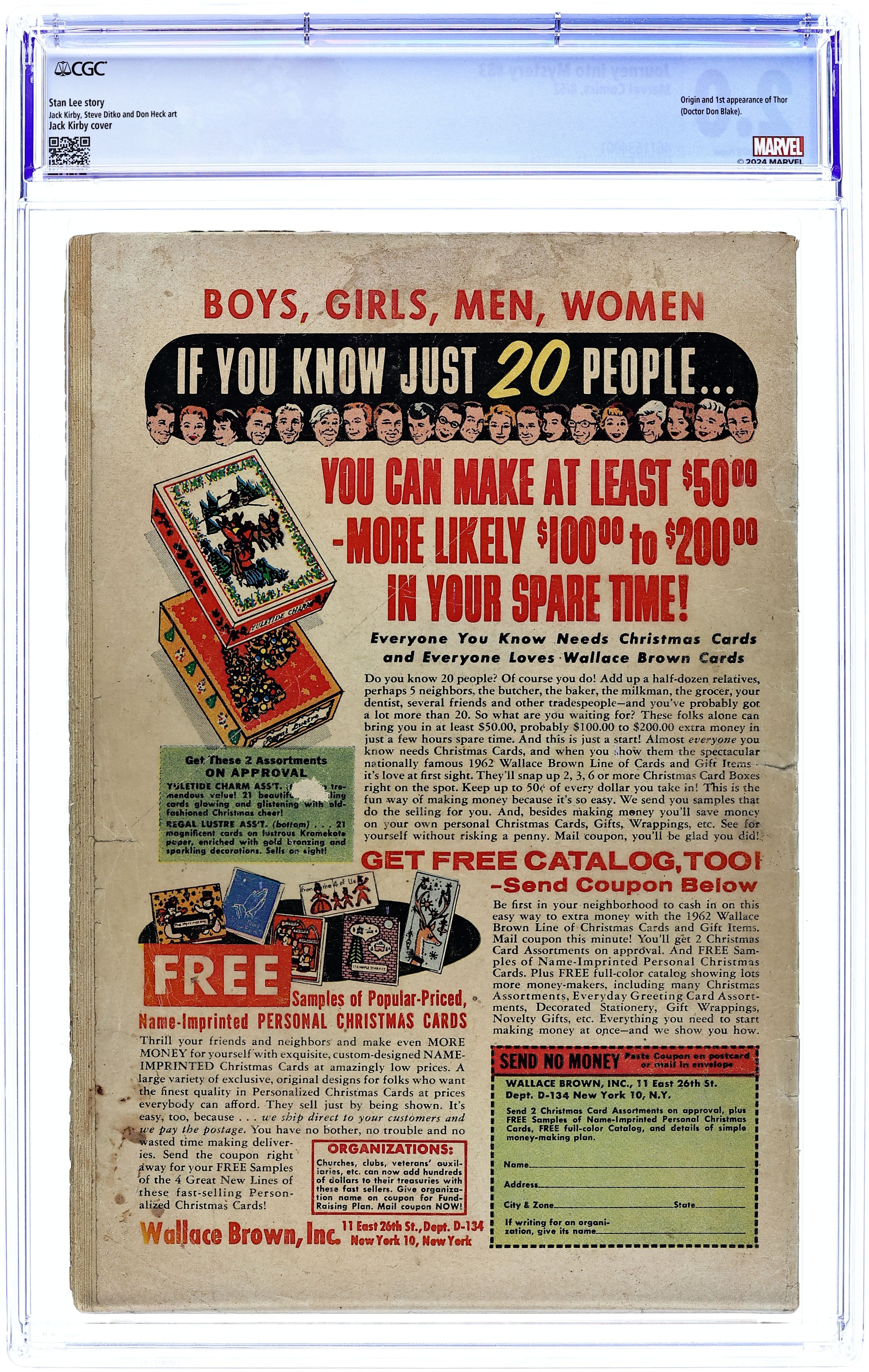 Cover pencils by Jack Kirby, inks by Joe Sinnott. First appearance and origin of Thor in "The Stone Men from Saturn!," script by Stan Lee (plot) and Larry Lieber (script), pencils by Jack Kirby, inks by Joe Sinnott; A lame doctor vacationing in Norway runs across an alien invasion; While hiding from the aliens in a cave he finds an old cane that transforms him into the god Thor; Thor drives back the alien invasion. "Discovery" two-page text story, art by Joe Maneely. "The Perfect Crime," script by Stan Lee, art by Don Heck; A crook tries to kill and rob a man by pushing him off a cliff, but finds that he is a flying man from Mercury. "When the Jungle Sleeps," script by Stan Lee, art by Steve Ditko; A lion is given superhuman intelligence by a nuclear test; It plans to attack humanity, but quickly loses its enhanced intelligence. 36 pgs., full color. $0.12. Cover price $0.12.