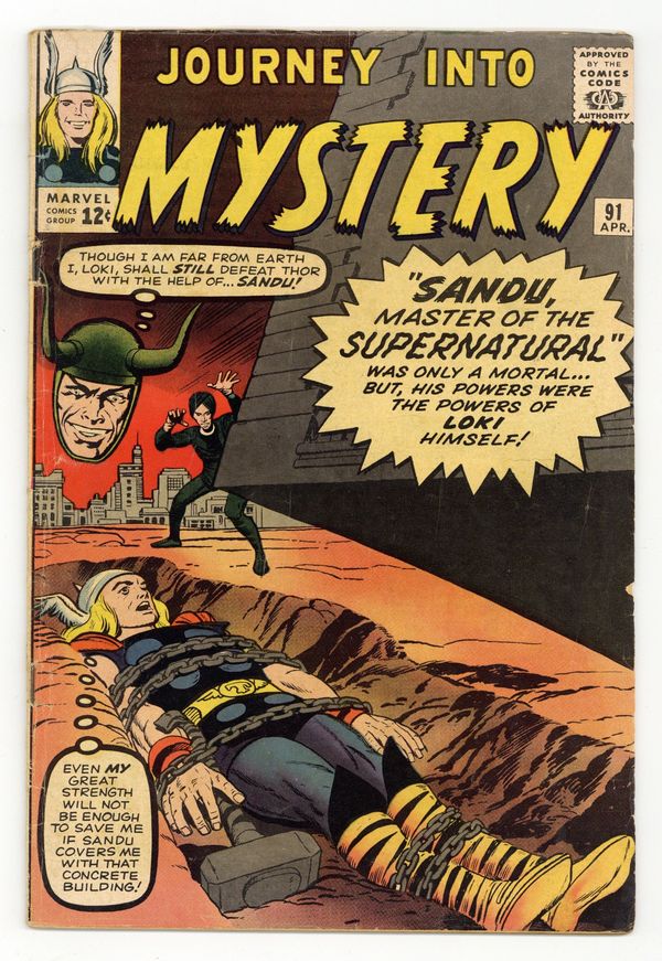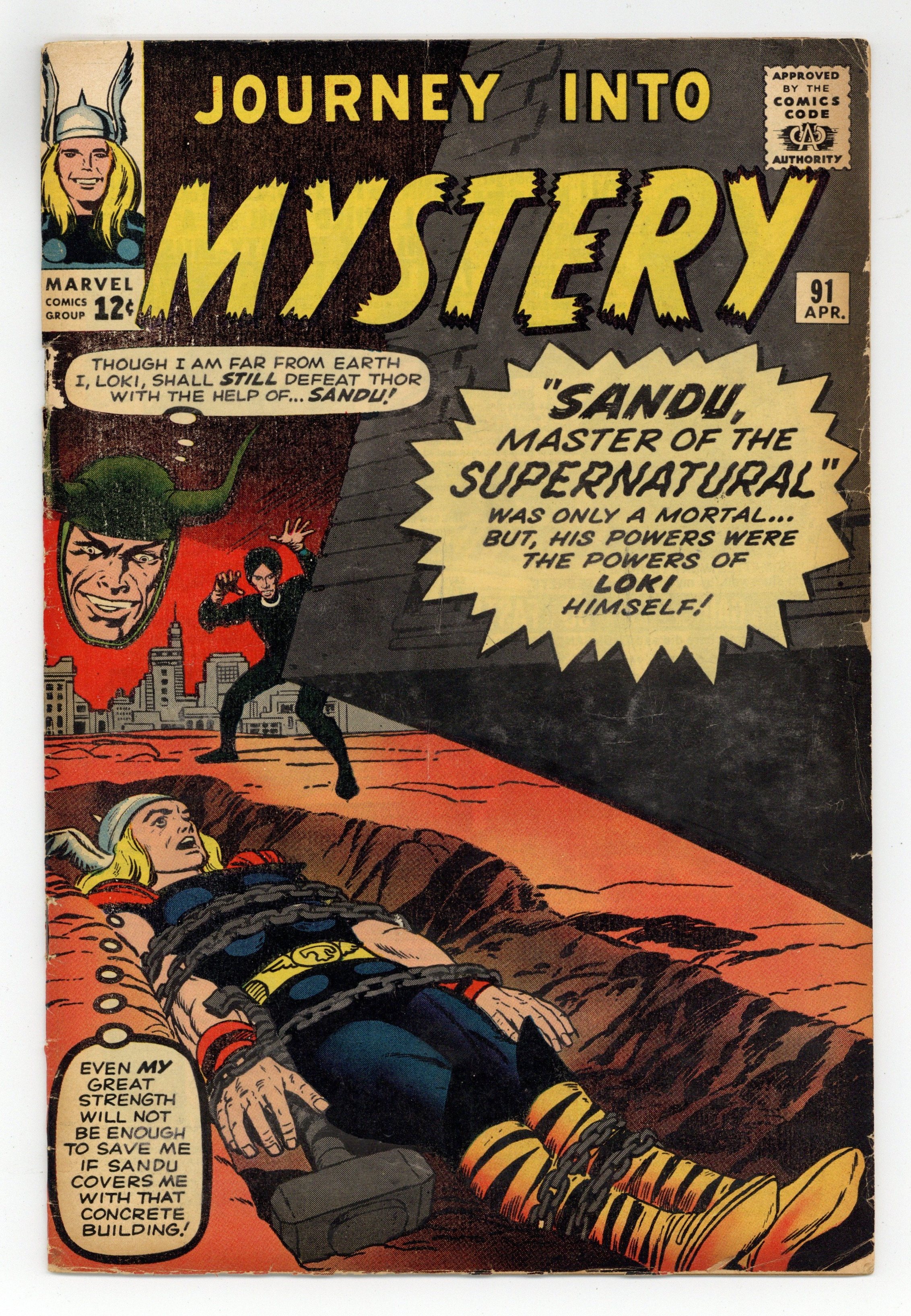 Cover pencils by Jack Kirby, inks by Dick Ayers. "Sandu, Master of the Supernatural!", script by Stan Lee (plot) and Larry Lieber (script), art by Joe Sinnott; Loki gives a greedy carnival mystic magical powers in order to use him to attack Thor; Thor is overcome in their first battle, but with the help of Odin and his belt of strength he defeats Loki's pawn; Jane Foster appearance; first appearance of Odin's Valkyries (cameo). "The Party" text story. "The Seedlings," script by Stan Lee (plot) and Larry Lieber (script), pencils by Larry Lieber, inks by Sol Brodsky; Alien spores land on Earth and bloom into telepathic plants that would have conquered the world had they not been eaten by crows. "The Manikins!", script by Stan Lee, art by Steve Ditko; An odd man works with the manikins in a department store, but becomes upset when one of the female manikins is to be put in a bridal display; The employee disappears and the groom is replaced with a manikin that looks just like him. 36 pgs., full color. Cover price $0.12.
