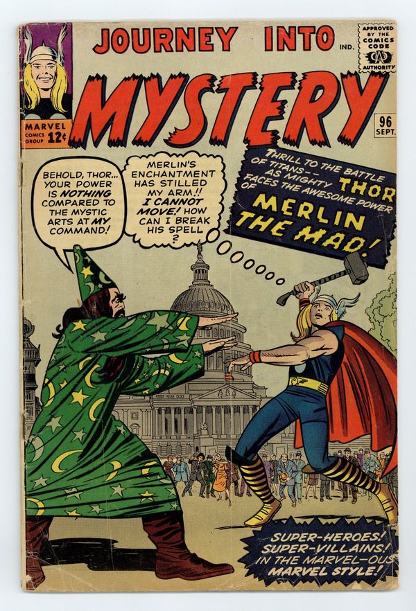 Starts Apr 20 Cover pencils by Jack Kirby, inks by Sol Brodsky. "Defying the Magic of... Mad Merlin!", script by Stan Lee (plot) and Robert Bernstein (script), art by Joe Sinnott; Merlin is awakened after a thousand years and immediately decides to try and take over the world; He battles Thor using familiar Washington D.C. monuments; Jane Foster appearance; Cameos by King Arthur and his knights, John F. Kennedy, Pierre Salinger, and Caroline Kennedy. The first half of a two-page text story, "The Traveler." "Call Her...Medusa!":, script by Stan Lee (plot) and Larry Lieber (script), pencils by Larry Lieber, inks by Paul Reinman; The gorgons of myth were aliens and send an agent to modern Earth preceding an invasion. "Frederick Fenton's Future!", script by Stan Lee, art by Steve Ditko; An arrogant rich man builds a time machine in order gain the secret to eternal life from the future. 36 pgs., full color. $0.12. Cover price $0.12.