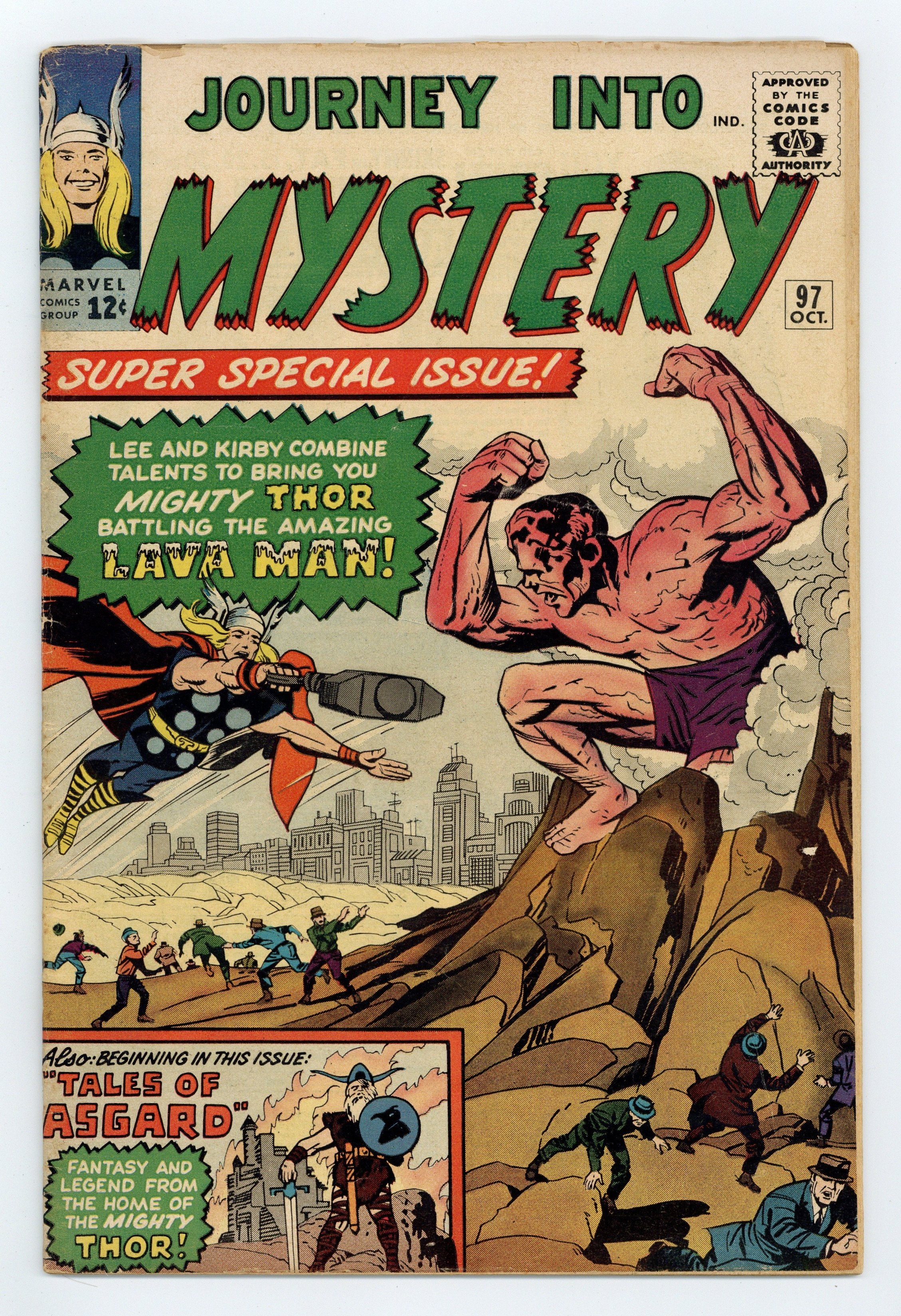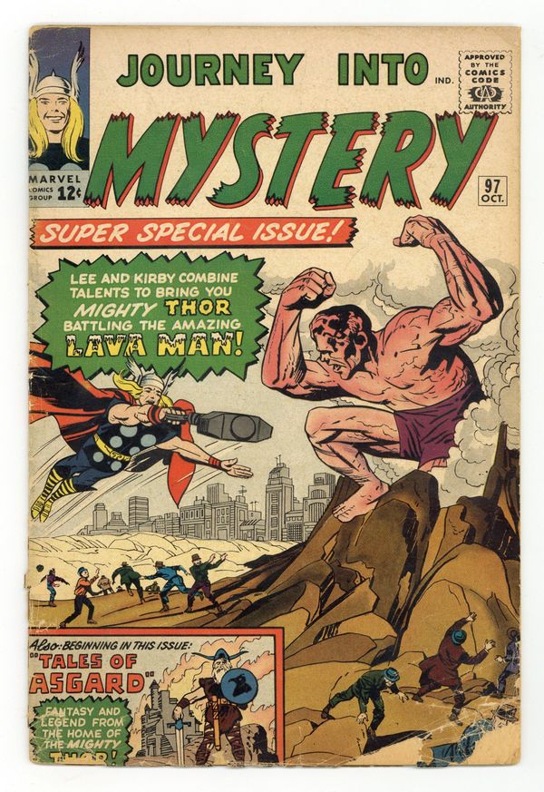 Tags: Marvel Legacy Numbering: Thor (part 97), Thor$112.00Cover pencils by Jack Kirby, inks by George Roussos. First appearance of the Lava Man in "The Mighty Thor Battles the Lava Man!", script by Stan Lee, pencils by Jack Kirby, inks by Don Heck; Thor battles the Lava Man, a monster brought to the surface by Loki, who claims all the dry surface of Earth for his people; Odin forbids Thor to love Jane Foster, leading to her leaving her job as Dr. Blake's nurse. "The Traveler" text story. "The Perfect Defense!", script by Stan Lee (plot) and Larry Lieber (script), pencils by Larry Lieber, inks by George Roussos (as George Bell); In the future, Earth has conquered all planets except one, which no expedition returns from; The military thinks they have some horrific defense, but in fact they are simply so kind to the humans that arrive to conquer that they don't want to leave. "Tales of... ...Asgard! Home of the Mighty Norse Gods," script by Stan Lee, pencils by Jack Kirby, inks by George Roussos (as G. Bell); Beneath Asgard lies the Well of Life. From it came Ymir, greatest of the Frost Giants and Buri, the first Norse God who gave life to Borr. Borr had three sons. Odin was one of them. 36 pgs., full color. Cover price $0.12.