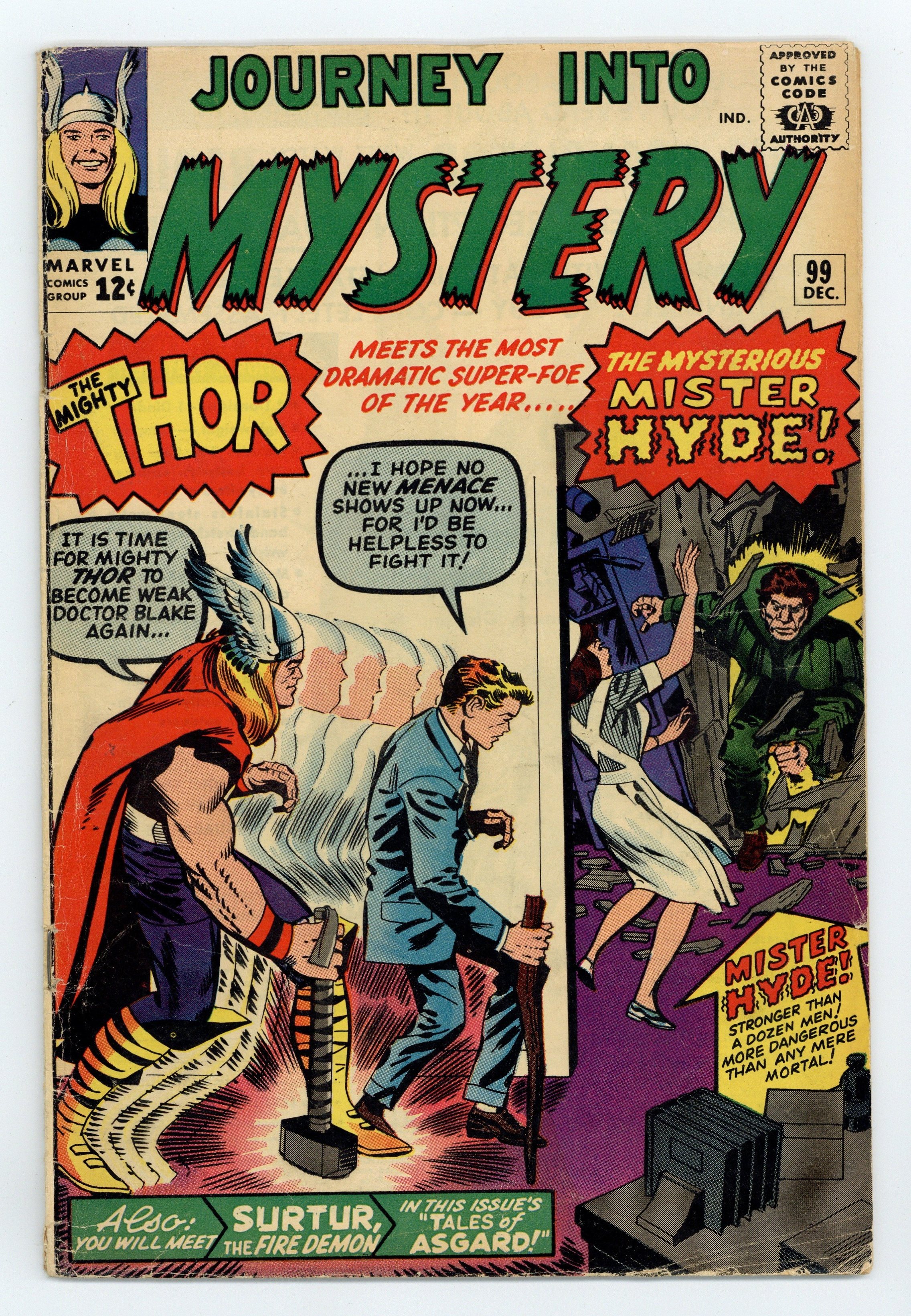 Cover pencils by Jack Kirby, inks by George Roussos. First appearance of Mr. Hyde in "The Mysterious Mister Hyde!", script by Stan Lee, art by Don Heck; Having been refused a job by Doctor Blake, Calvin Zabo becomes Mister Hyde and attacks the doctor; Meanwhile, Odin has agreed to let Thor marry Jane Foster if she proves worthy. "The Thread" text story. "Stroom's Strange Solution!", script by Stan Lee (plot) and Larry Lieber (script), pencils by Larry Lieber, inks by Matt Fox; An alien world is dangerously overpopulated, so a scientist releases a gas that shrinks the entire population, making the same amount of space accommodate more people. Third "Tales of Asgard" installment, "Surtur the Fire Demon!, script by Stan Lee, pencils by Jack Kirby, inks by George Roussos; The Trolls ally with Surtur against Asgard, but Odin conquers them; Surtur travels to Earth to destroy it. 36 pgs., full color. $0.12. Cover price $0.12.