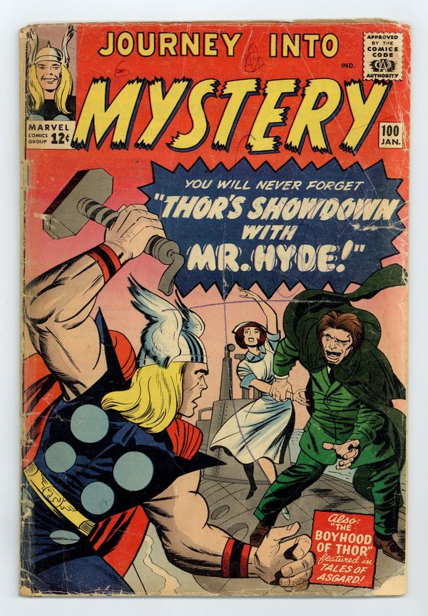 Starts Apr 20 Cover pencils by Jack Kirby, inks by Sol Brodsky. "The Master Plan of Mr. Hyde!", script by Stan Lee, art by Don Heck; Mister Hyde kidnaps Don Blake and Jane Foster and then tries to steal a submarine using Jane as a hostage; Jane stops Thor from catching Hyde because she thinks that Don is still in danger; The police realize that Hyde framed Thor for the bank robbery, but Jane's actions convince Odin that she is unworthy of immortality. "Tricky Travel" text story. "The Unreal!", script by Stan Lee (plot) and Larry Lieber (script), pencils by Larry Lieber, inks by Matt Fox; A man recounts a dream to a psychiatrist, in which he meets and fights an alien on an expedition; The psychiatrist dismisses the importance of the dream, since the alien "human" that he describes couldn't exist. Fourth "Tales of Asgard" installment, "The Storm Giants!", script by Lee, pencils by Jack Kirby, inks by Paul Reinman; This is the first "Boyhood of Thor" story; Thor and Loki (as children) defeat three Storm Giants and return the Golden Apples of Iduna. 36 pgs., full color. Cover price $0.12.