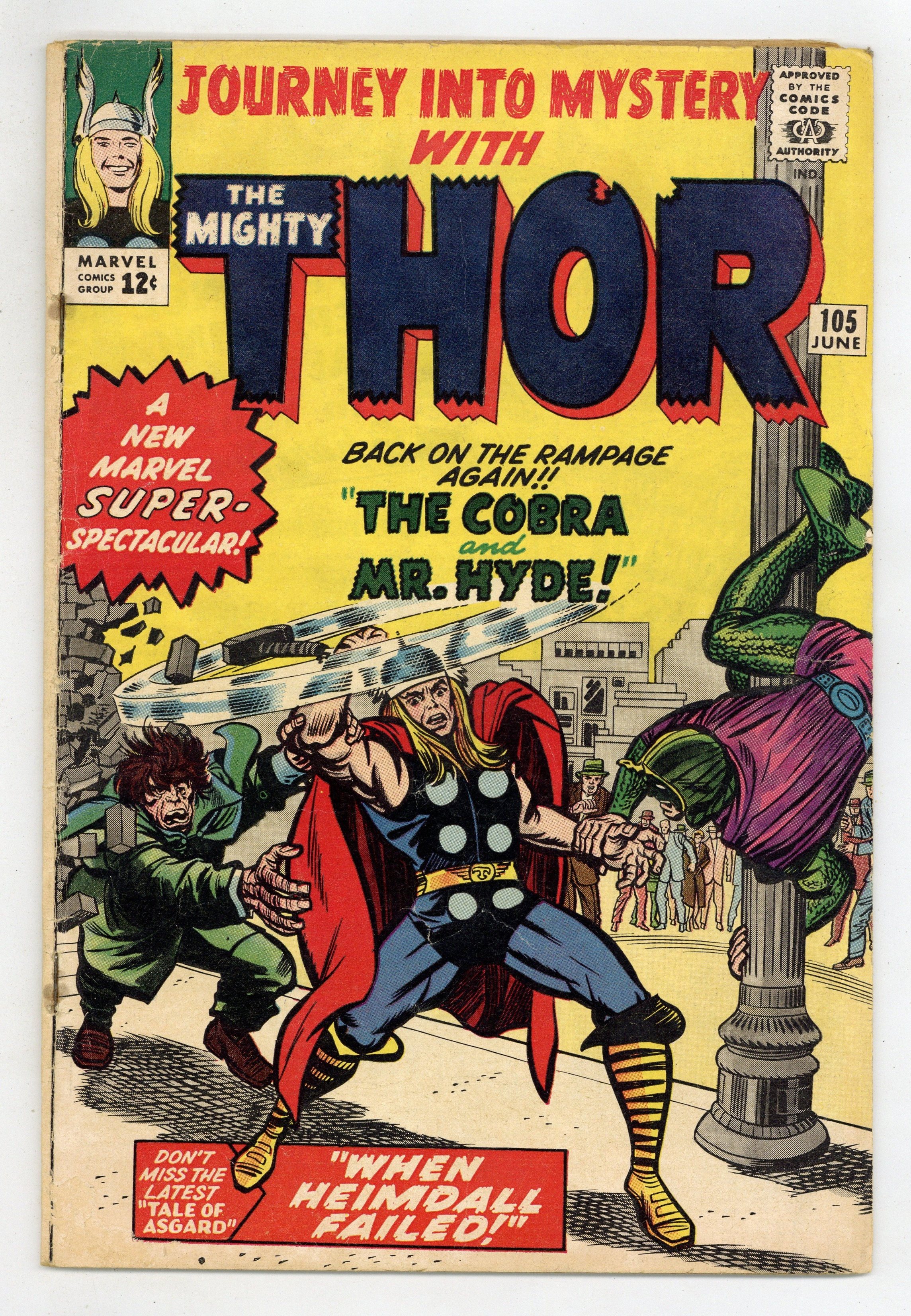 Cover pencils by Jack Kirby, inks by Chic Stone. "The Cobra and Mr. Hyde!", script by Stan Lee, pencils by Jack Kirby, inks by Chic Stone; The Cobra meets Mister Hyde and they join forces to defeat Thor; They track Thor to Dr. Blake's office, and demand that Blake help them find Thor; Blake becomes Thor while their backs are turned and fights the two villains until they manage to take his hammer from him. "Tales of Asgard" back-up: "When Heimdall Failed!", script by Stan Lee, pencils by Jack Kirby, inks by George Roussos (as "George Bell"); In hope of attacking Asgard, King Brimer and Queen Nedra send a Vanna to pass by Heimdall and spy on them. First half of a two-page text story, "Marauder." 36 pgs., full color. Cover price $0.12.