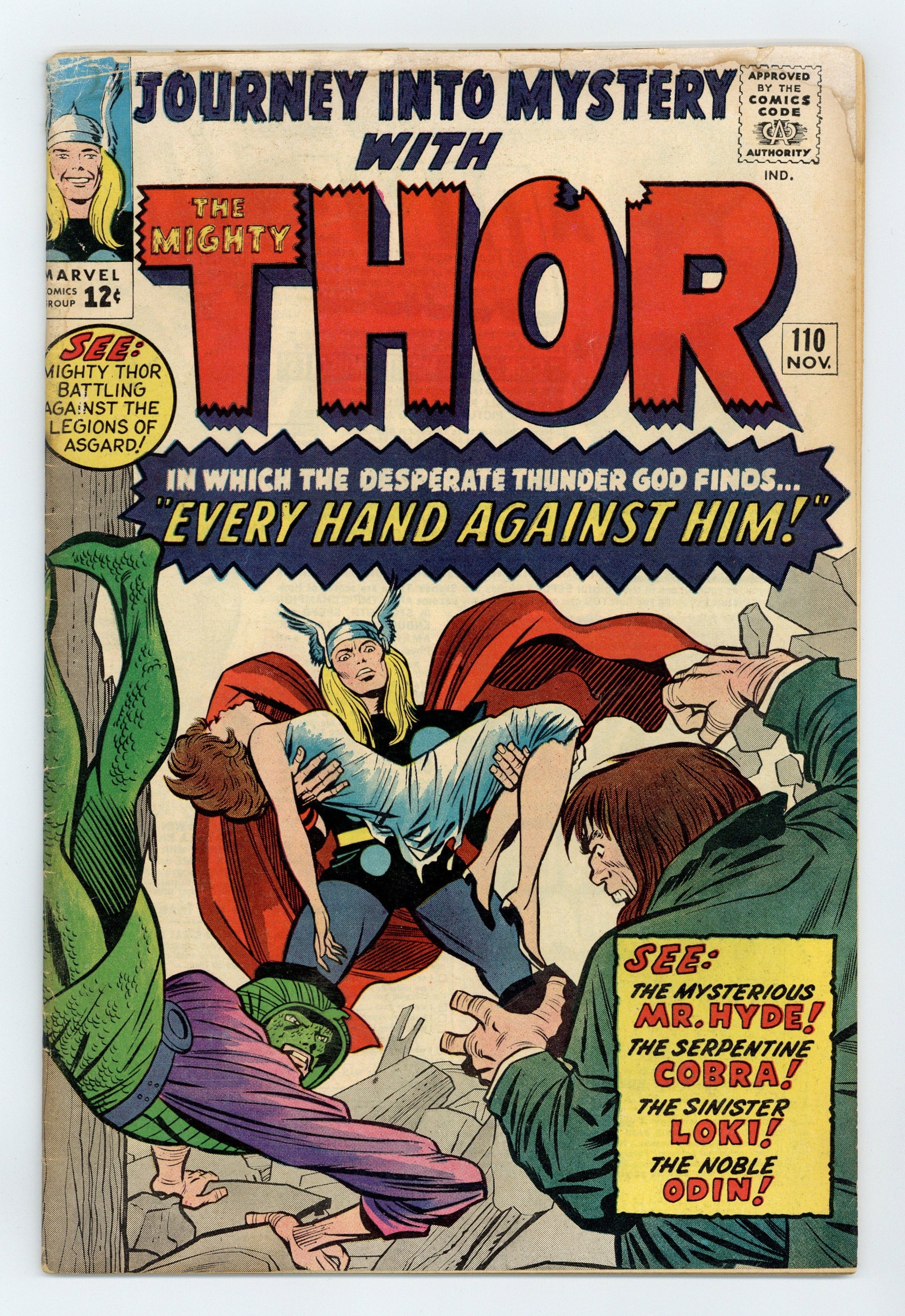 Tags: Marvel Legacy Numbering: Thor (part 110), Thor$54.00Cover pencils by Jack Kirby, inks by Chic Stone. Thor just can't catch a break--he faces Loki, the Cobra, and Mr. Hyde in "Every Hand Against Him!", script by Stan Lee, pencils by Jack Kirby, inks by Chic Stone; Loki sends the Cobra and Mr. Hyde to kidnap Jane; Thor confronts them but is forced to back down and let them go after they threaten to hurt her; Odin, witnessing the scene, expresses his displeasure at Thor's "weakness" and banishes him from Asgard; Thor explains that his former actions were a result of Loki's trickery; Odin allows Thor to return to Earth where he battles the villains again; He rescues Jane but she is critically ill; Whirling his hammer, Thor creates a vortex around Jane in which time stands still; This will afford him the opportunity to finish his battle with Cobra and Hyde; Appearances by Jane Foster and Heimdall. Marvel Masterwork Pin-Up of Thor, pencils by Jack Kirby, inks by Chic Stone. "Tales of Asgard" back-up, "The Defeat of Odin!" Script by Lee, pencils by Kirby, inks by Vince Colletta; Was Odin defeated by an army of men, or did he stage the battle to teach the gods a lesson? The revelation of what M.M.M.S. stands for. 36 pgs., full color. Cover price $0.12.