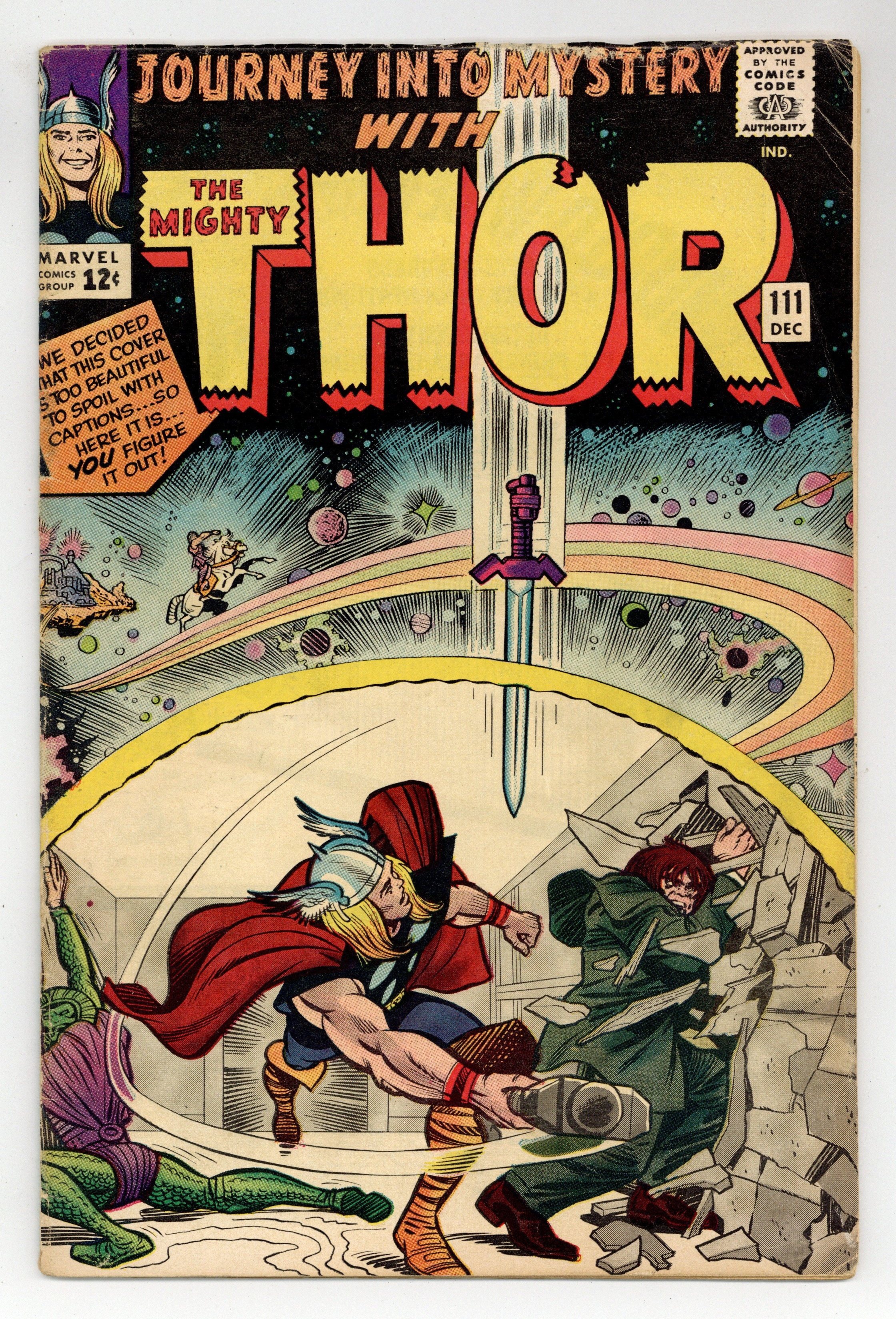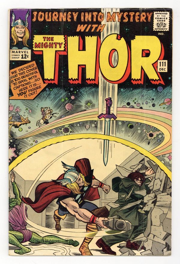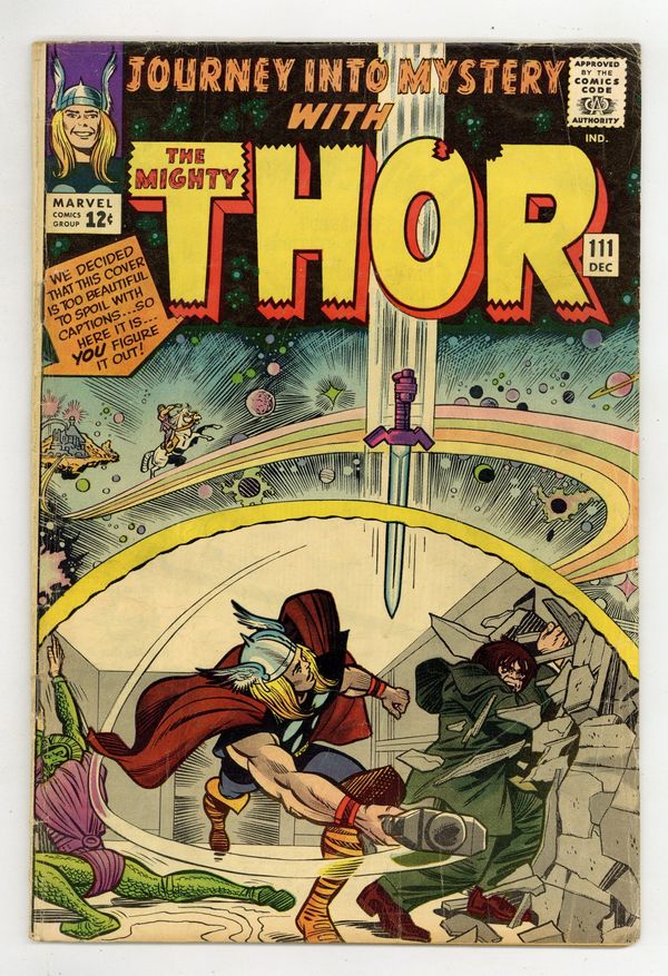 Cover pencils by Jack Kirby, inks by Chic Stone. Loki, the Cobra, and Mr. Hyde are still up to no good in "The Power of the Thunder God!", script by Stan Lee, pencils by Jack Kirby, inks by Chic Stone; Thor battles the Cobra and Mr. Hyde while Jane Foster hovers close to death; Odin's heart begins to soften towards Jane, thanks to the intervention of Balder; Odin, in his infinite wisdom, commands Loki to deliver a message to Hardol, the mystic healer, who lives beyond the molten chasm; Loki has no choice but to obey but is waylaid by Balder and some other gods who, for some reason, distrust him. Balder delivers the message himself; Thor defeats the Cobra and Hyde. Loki pinup, pencils by Jack Kirby, inks by Dick Ayers. "Tales of Asgard" back-up: "The Secret of Sigurd!", script by Stan Lee, pencils by Jack Kirby, inks by Vince Colletta; When out walking with Balder and Loki, Thor is challenged to a duel by Sigurd; They fight and Thor knocks Sigurd to the ground repeatedly; However, each time Sigurd gets up he is stronger than ever. Balder remembers the key to Sigurd's increasing strength; He is a son of the Earth Sprites; his strength comes from the very ground itself; Thor hooks his hammer under Sigurd's belt and flings him skywards where he will be stranded on a deserted asteroid. 36 pgs., full color. Cover price $0.12.