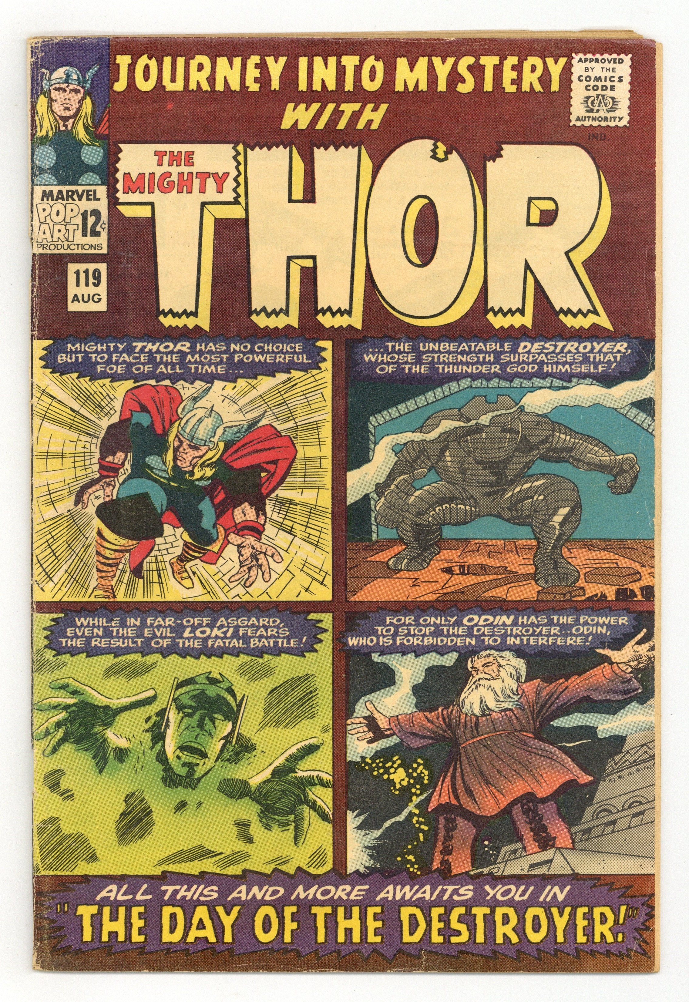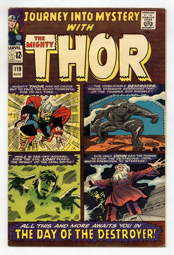 Tags: Marvel Legacy Numbering: Thor (part 119), Thor$55.00Cover pencils by Jack Kirby, inks by Vince Colletta. "The Day of the Destroyer!", script by Stan Lee, pencils by Jack Kirby, inks by Vince Colletta; The Destroyer is a near-indestructible automaton created by Odin countless ages ago to defend mankind from some unknown future foe; However, Loki, the god of mischief has manipulated a mortal into activating The Destroyer and having it target his half-brother Thor! Ad for Thor annual. "Tales of Asgard" back-up: "Gather, Warriors!", script by Stan Lee, pencils by Jack Kirby, inks by Vince Colletta; With an army of hand-picked warriors, Thor prepares to sail into the unknown to discover what dread power has caused a crack in Odin's Oversword of Asgard, for if the crack should grow larger, it could spell the death of the universe; First appearances of Hogun, Fandrall, and Volstagg. The Merry Marvel Bullpen Page. 36 pgs., full color. $0.12. Cover price $0.12.