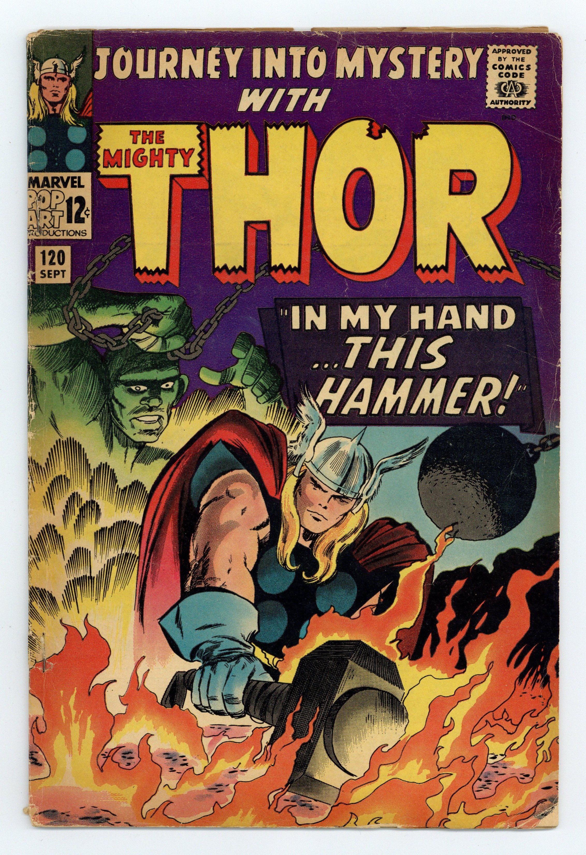 Tags: Marvel Legacy Numbering: Thor (part 120), Thor$31.50Cover pencils by Jack Kirby, inks by Vince Colletta. "With My Hammer In Hand...!", script by Stan Lee, pencils by Jack Kirby, inks by Vince Colletta; Thor reforges Mjolnir, returns to Asgard with the Norn Stones, and is declared the victor in the contest with Loki; But Thor cannot long endure the peacefulness of Asgard and begs Odin to send him back to Earth; On Earth, Thor finds Dr. Blake's office deserted and in disarray, with bills unpaid for weeks, and Jane Foster nowhere to be found!; Loki, meanwhile, has overthrown the warlock Ularic. Tales of Asgard tale: "Set Sail!", script by Stan Lee, pencils by Jack Kirby, inks by Vince Colletta; Thor leads the Asgardian gods on a voyage into unknown territory to discover what has cracked the Oversword. The Merry Marvel Bullpen Page. 36 pgs., full color. $0.12. Cover price $0.12.