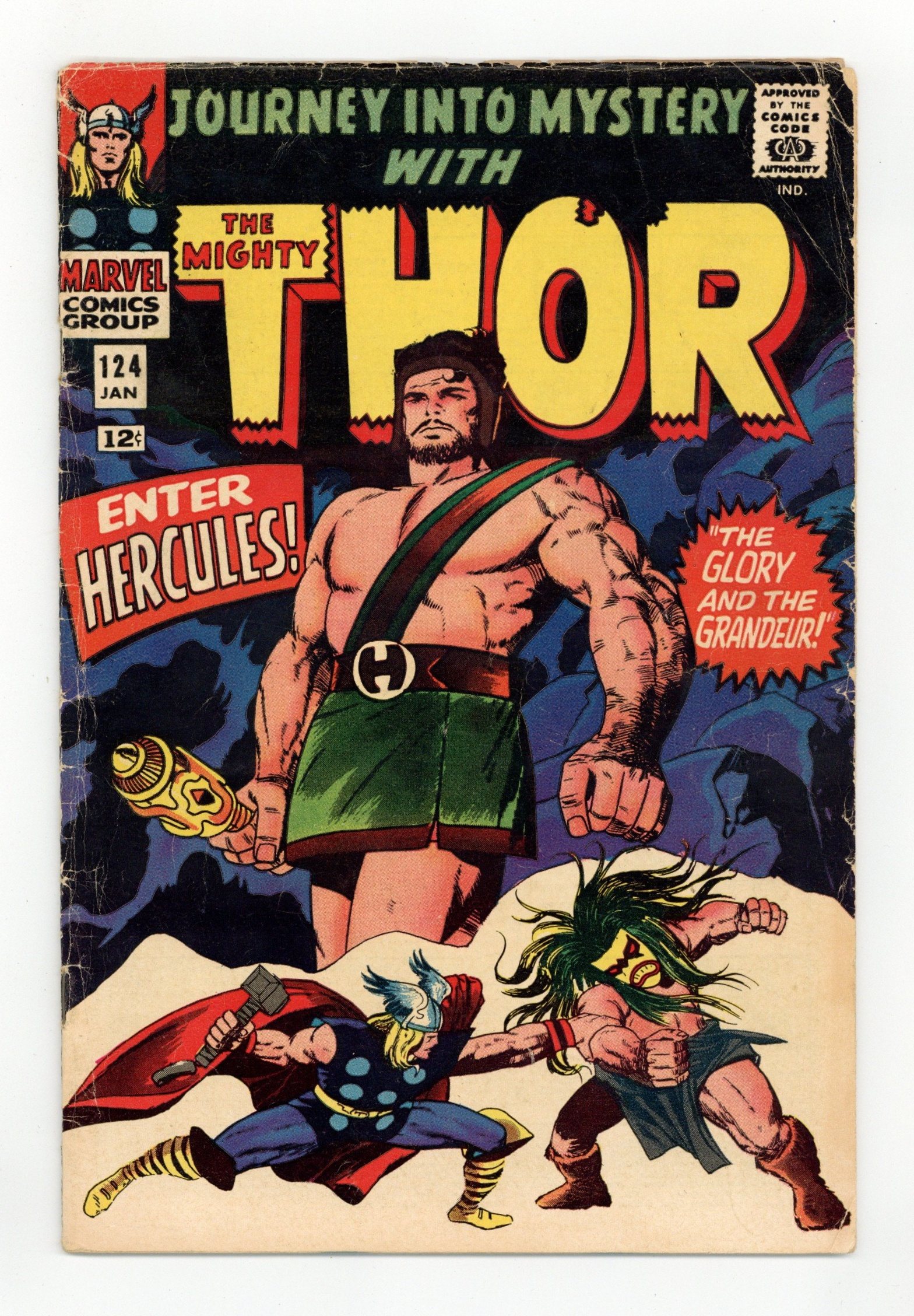Cover pencils by Jack Kirby, inks by Vince Colletta. First appearance of Atlas in "The Grandeur and the Glory!", script by Stan Lee, pencils by Jack Kirby, inks by Vince Colletta; Thor learns of a "demon" terrorizing the jungles of Asia; Donald Blake reveals his secret to Jane, infuriating Odin; And, Zeus dispatches Hercules to Earth to deal with the native turned "Demon." Tale of Asgard: "Closer Comes the Swarm!", script by Stan Lee, pencils by Jack Kirby, inks by Vince Colletta; While the Asgardians are licking their wounds after a battle with a dragon, Queen Ula sends out the Flying Trolls of Thryheim to finish them off. Appearances by Balder, Hogun, Fandral, and Volstagg. 36 pgs., full color. $0.12. Cover price $0.12.