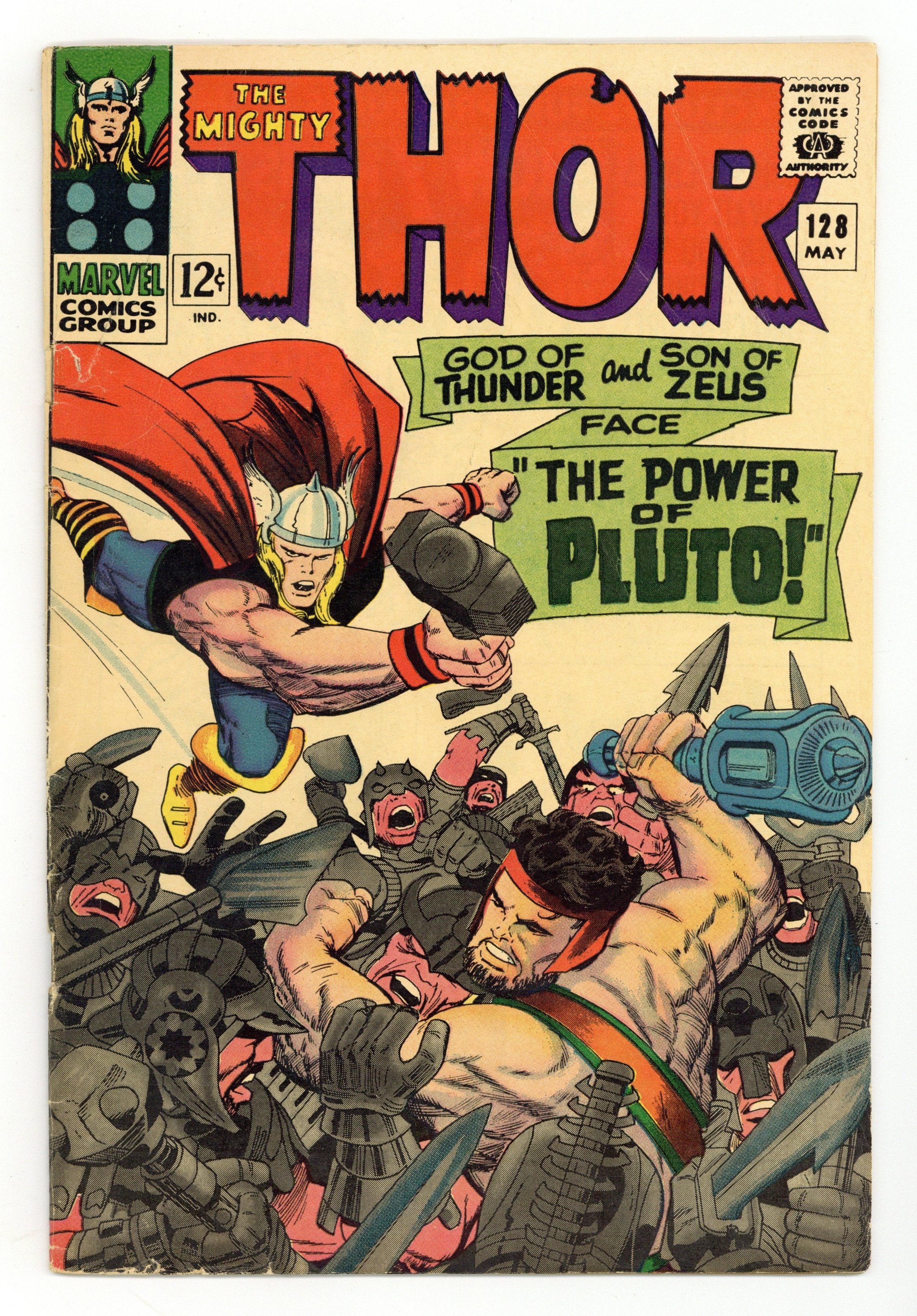 Cover pencils by Jack Kirby, inks by Vince Colletta. "The Power of Pluto!", script by Stan Lee, pencils by Jack Kirby, inks by Vince Colletta; Thor recovers from his injuries last issue and goes looking for a rematch with Hercules who has been tricked into signing a contract with Pluto. Appearances by Odin, Balder, and Volstagg. Tale of Asgard: "Aftermath!", script by Stan Lee, pencils by Jack Kirby, inks by Vince Colletta; The Asgardian gods deliberate over the coming of Ragnarok. Appearance by Odin; cameos by Balder, Hogun, Fandral, and Volstagg. 36 pgs., full color. $0.12. Cover price $0.12.