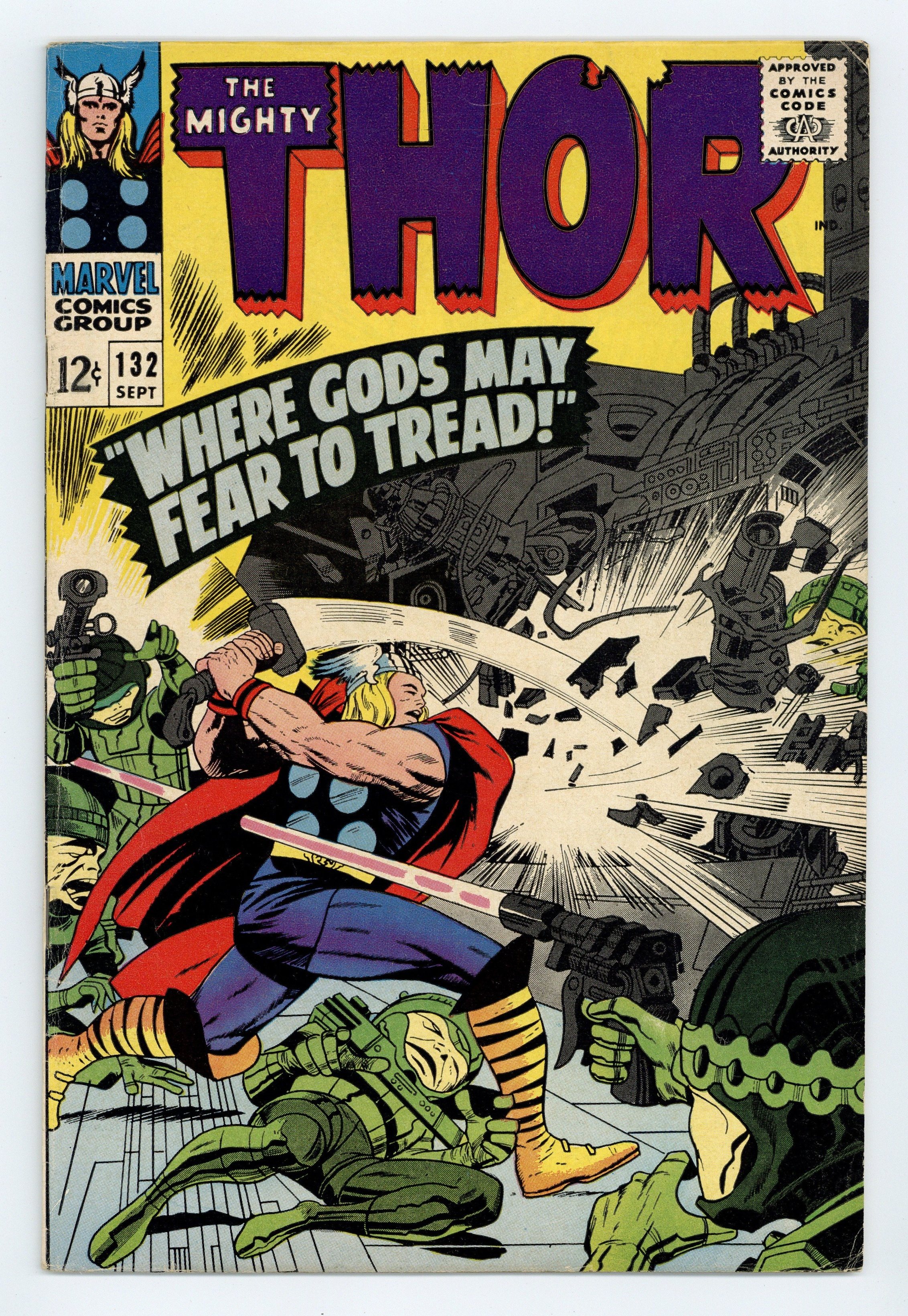 Tags: Marvel Legacy Numbering: Thor (part 132), Thor$25.00Cover pencils by Jack Kirby, inks by Vince Colletta. First appearances of Ego the Living Planet and the Recorder in "Rigel: Where Gods May Fear to Tread!", script by Stan Lee, pencils by Jack Kirby, inks by Vince Colletta; Thor travels to the planet Rigel to deal with the Colonizers in person; Hes diverted by the menace of Ego. Appearance by Jane Foster. Tale of Asgard: "The Dark Horse of Death!", script by Stan Lee, pencils by Jack Kirby, inks by Vince Colletta; Thor and companions rest after defeating Harokin's Hordes; Harokin, mortally wounded, waits for the Black Stallion of Doom. Letter to the editor from comics artist Dave Cockrum. 36 pgs., full color. $0.12. Cover price $0.12.