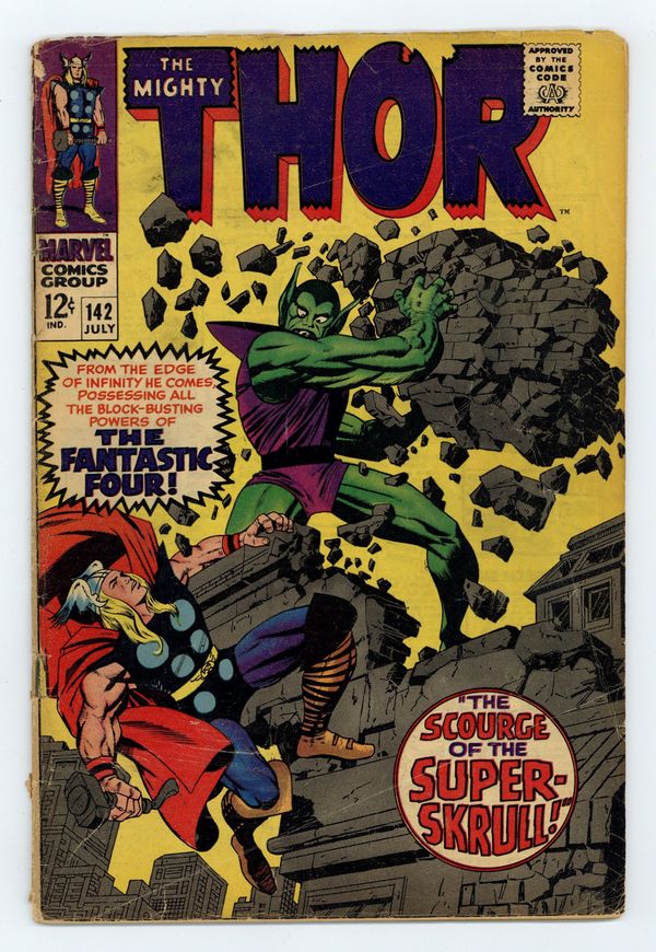 Tags: Marvel Legacy Numbering: Thor (part 142), Thor$16.00Cover pencils by Jack Kirby, inks by Vince Colletta. "The Scourge of the Super-Skrull!", script by Stan Lee, pencils by Jack Kirby, inks by Vince Colletta; The Super-Skrull, influenced by Loki, attacks and is beaten by Thor; Meanwhile, Odin sends Sif and Balder to find the evil Enchanters in the land of Ringsfjord. Tale of Asgard: "We, Who Are About to Die...!", script by Stan Lee, pencils by Jack Kirby, inks by Vince Colletta; Mogul's Demon Riders attack Thor and his companions. 36 pgs., full color. $0.12. Cover price $0.12.