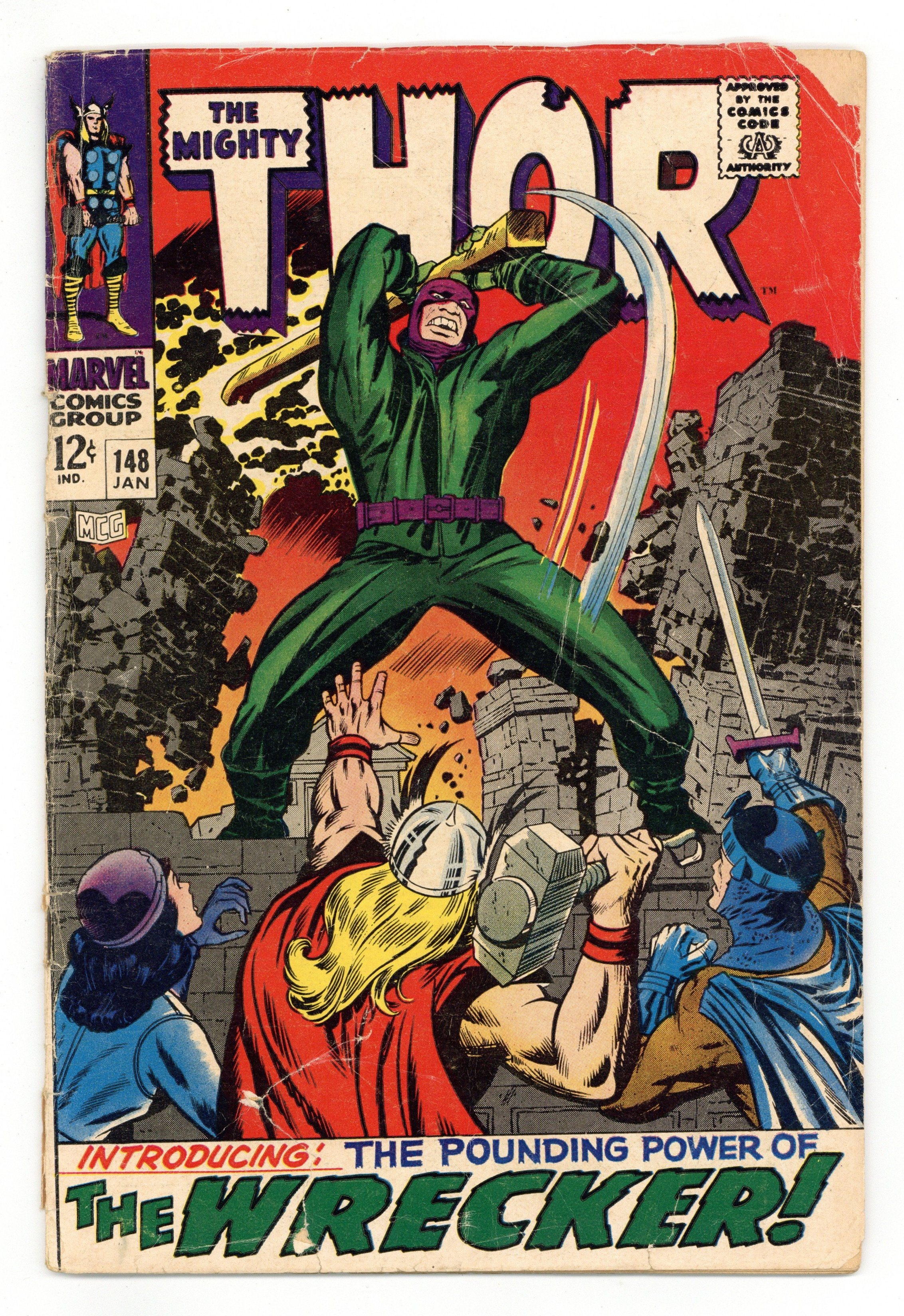 Starts Mar 9 Cover pencils by Jack Kirby, inks by Vince Colletta. First appearance of the Wrecker in "Let There Be... Chaos!", script by Stan Lee, pencils by Jack Kirby, inks by Vince Colletta; All the Asgardians on earth have their powers removed by Odin; Loki, trying to get power from Karnilla, accidentally creates the Wrecker who attacks Thor. Appearances by Balder, Sif, Odin, and Loki. Spider-Man cameo. Origins of the Inhumans back-up: "And Finally: Black Bolt!", script by Stan Lee, pencils by Jack Kirby, inks by Joe Sinnott; Agon and Rynda have altered their infant son's genetic pattern to give him the powers of levitation and electron manipulation, but they discover that he has a more dangerous and destructive power in his voice. 36 pgs., full color. $0.12. Cover price $0.12.