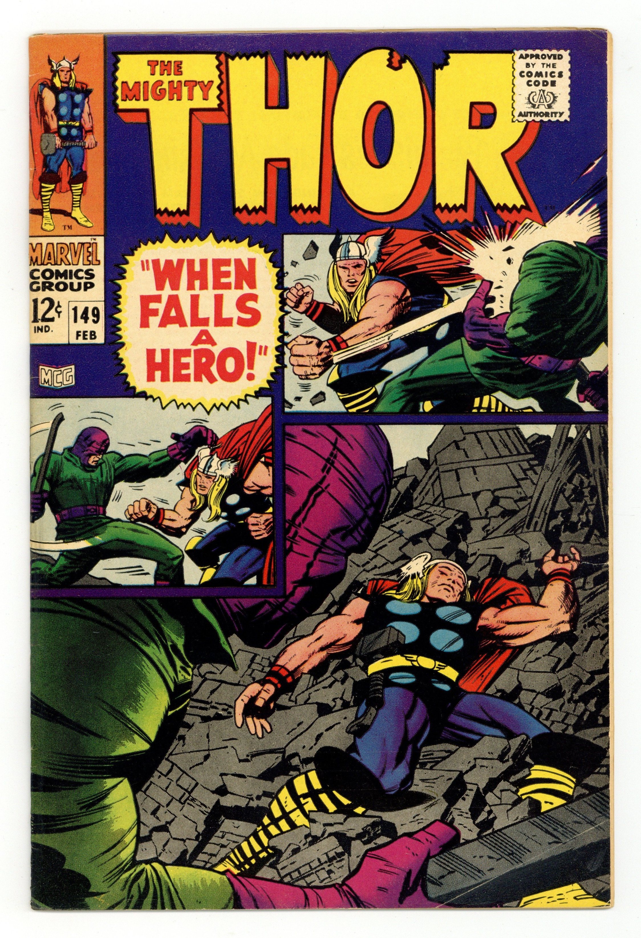 Tags: Marvel Legacy Numbering: Thor (part 149), Thor$23.00Cover pencils by Jack Kirby, inks by Vince Colletta. "When Falls a Hero!", script by Stan Lee, pencils by Jack Kirby, inks by Vince Colletta; Stripped of his Godly powers, Thor must now face the Wrecker, who has been granted mystical powers accidentally by Karnilla the Norn Queen; As their battle rages on in New York City, Thor can only maintain a defensive and is soon easily beat into submission by the simple minded crook; While in faraway Asgard, Balder and Sif can only watch in horror as their friend and ally is savaged on Earth; No longer able to stand being idle and doing nothing, Sif convinces Balder to join her in trying to convince Odin to come to Thor's rescue; Overhearing this, Loki decides to steal the mystic crystal; Plot crossover with the Fantastic Four 73. "Origins of the Inhumans" back-up: "Silence or Death!", script by Stan Lee, pencils by Jack Kirby, inks by Joe Sinnott; Black Bolt, who has been kept in isolation because of his deadly voice, finally meets his cousins and his brother Maximus; Maximus attacks Black Bolt hoping to make Black Bolt speak and prove himself unworthy to rule; Origins of Black Bolt, Medusa, Crystal, Maximus, Gorgon, and Karnak. 36 pgs., full color. Cover price $0.12.
