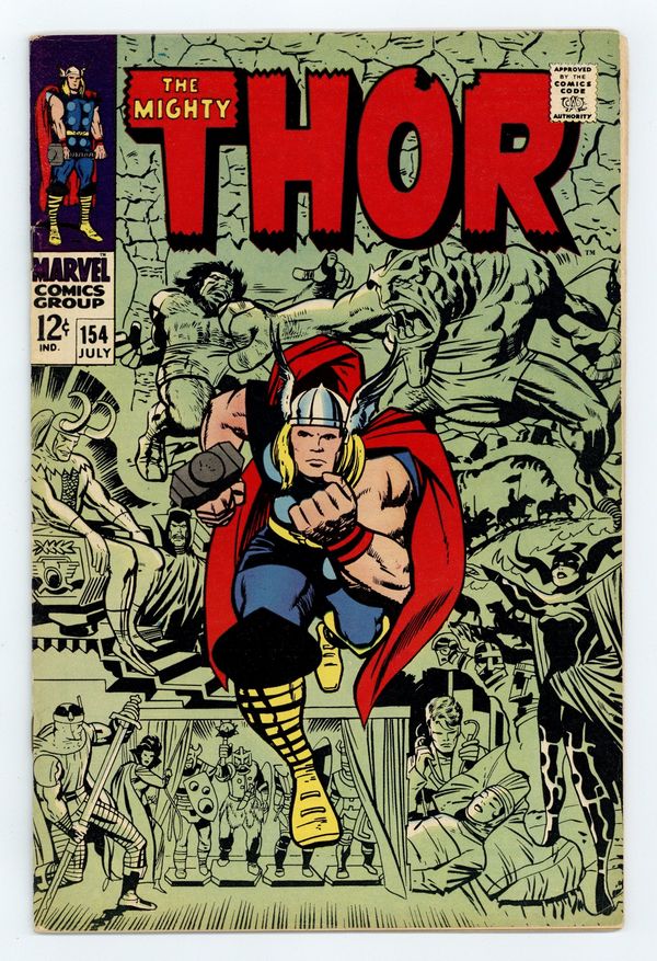 Tags: Marvel Legacy Numbering: Thor (part 154), Thor$35.50Cover pencils by Jack Kirby, inks by Vince Colletta. First appearance of the Mangog in "To Wake the Mangog!", script by Stan Lee, pencils by Jack Kirby, inks by Vince Colletta; While Sif recovers, Hela shows Thor the glory of eternal battle he can enter if he surrenders to her; Loki takes the throne of Asgard while Odin undergoes the Odinsleep; Ulik frees Mangog from captivity. Appearances by Balder, Sif, and Karnilla. 36 pgs., full color. $0.12. Cover price $0.12.